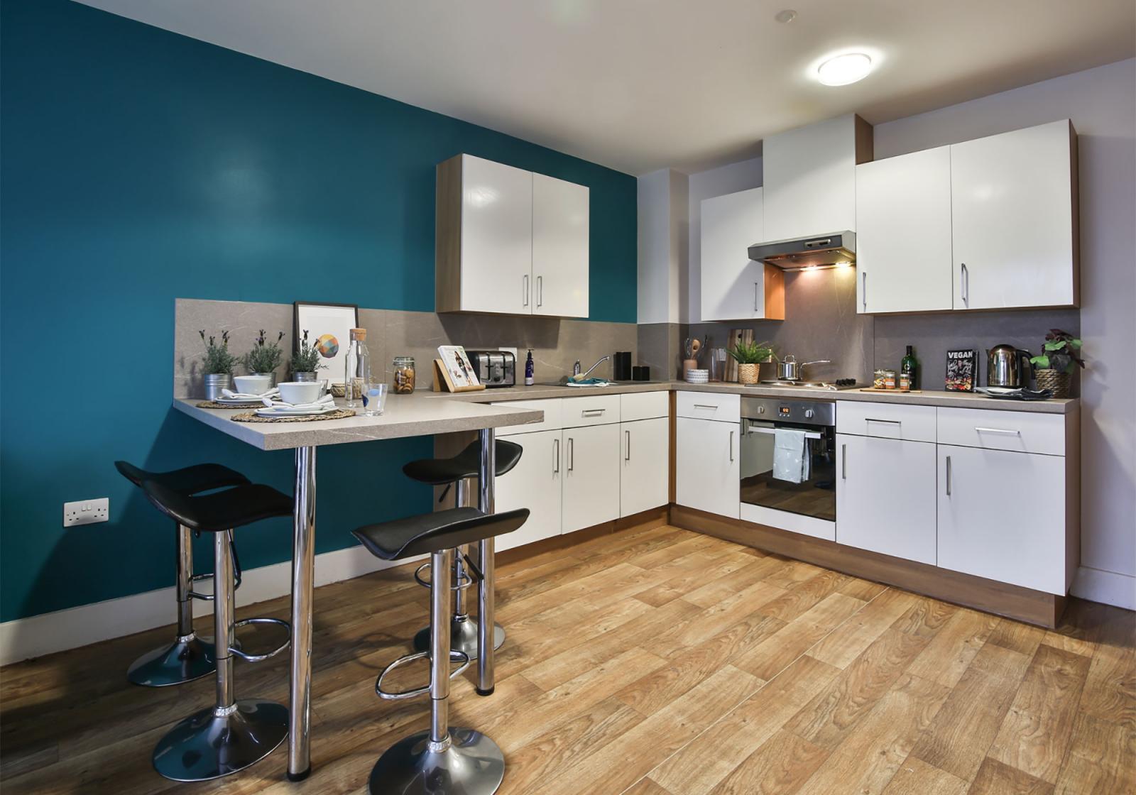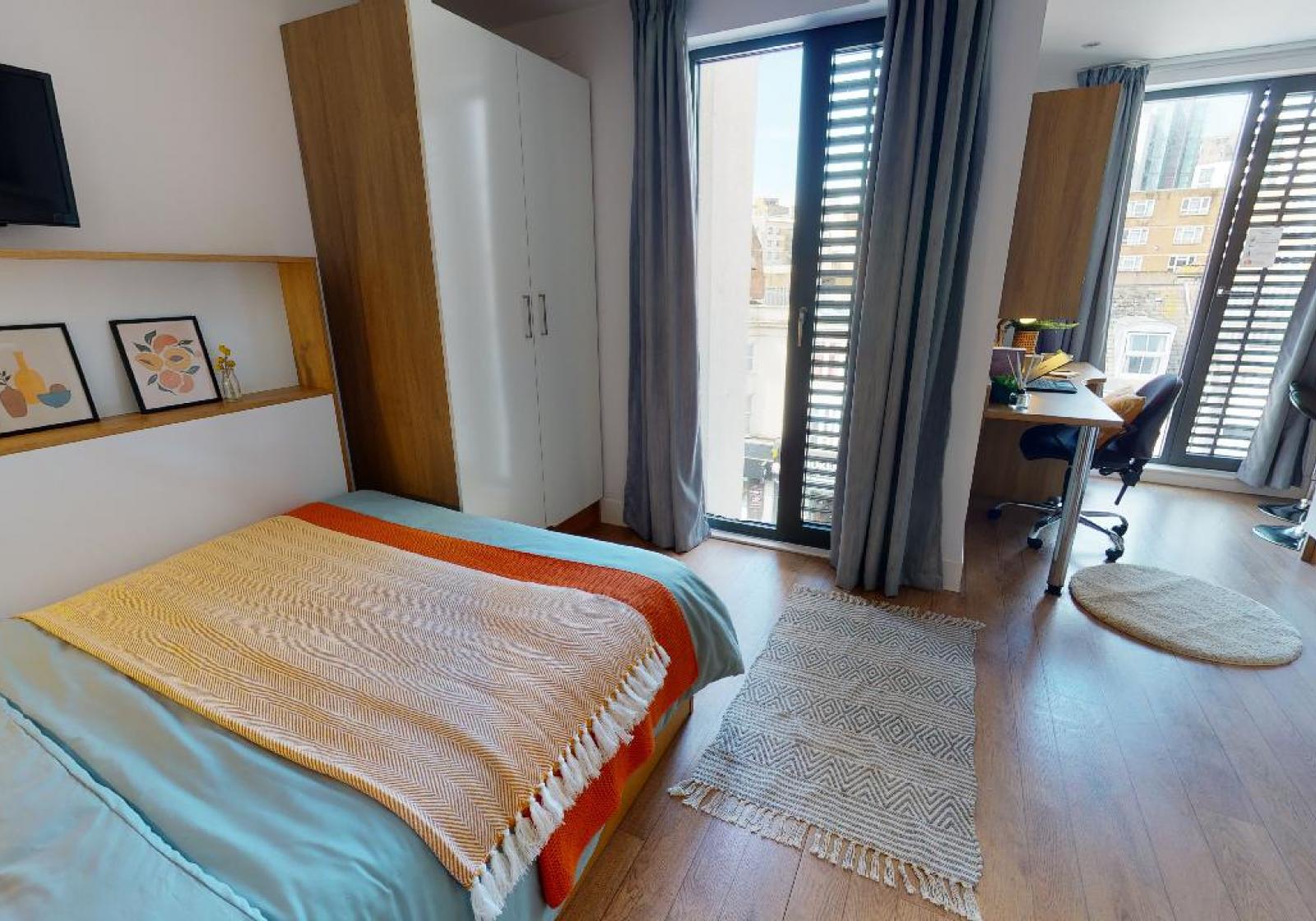 With 17-18 sq m of living space, wooden floors, stylish modern decor and lots of natural light, your Bronze Studio gives you a spacious living environment. With a lots of storage, double bed, private bathroom, TV, fully fitted kitchenette, breakfast bar with stylish bar stools plus study desk and chair, it’s got everything you need. With great social spaces in the building including a pool table and piano, you get the best of both worlds.