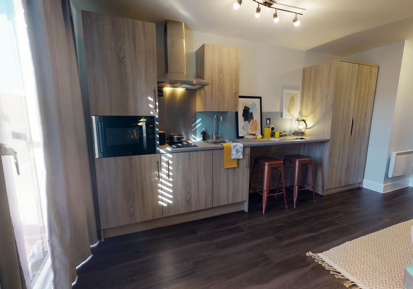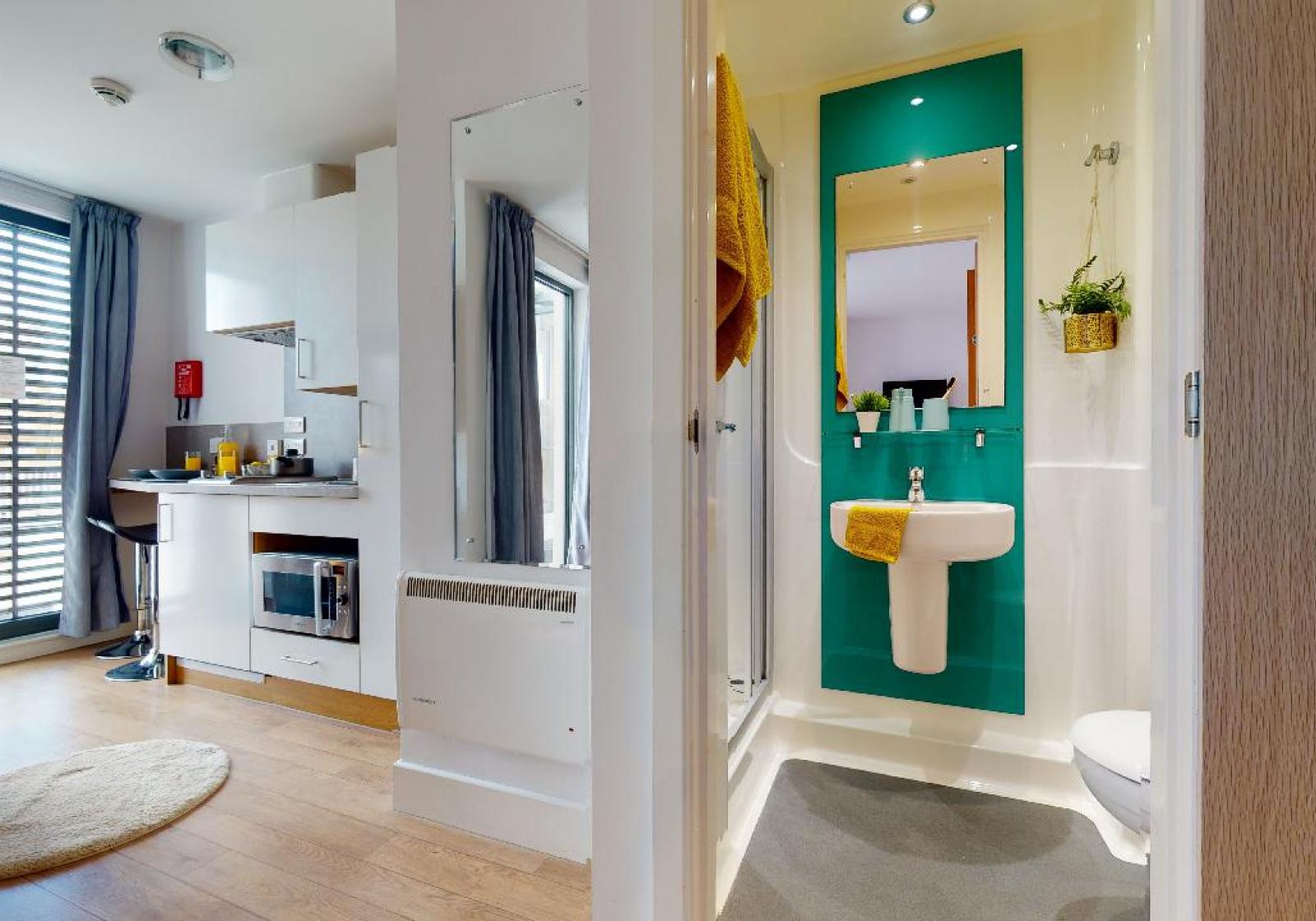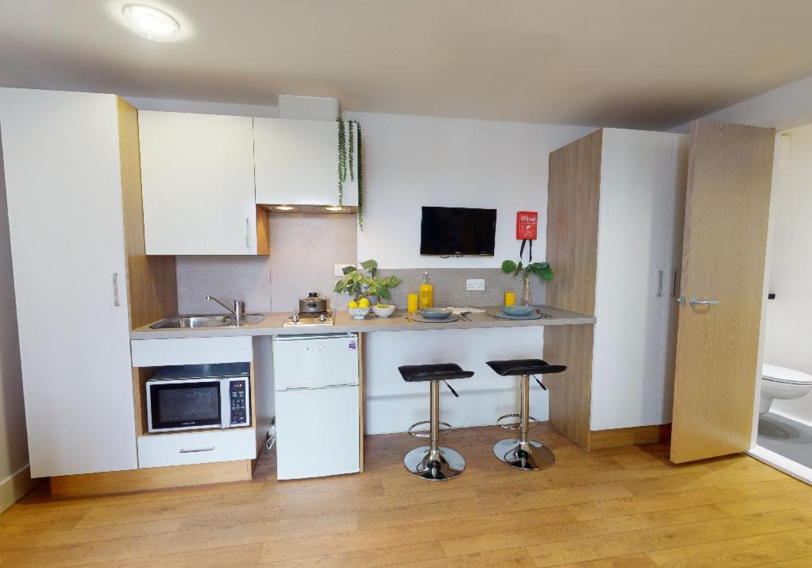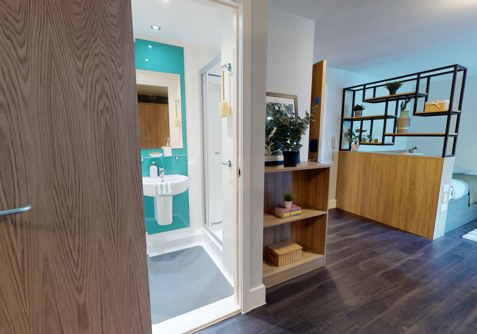 These smart studios provide a stylish living space with a bed, study area, storage and an en suite shower room. You will also have your own kitchenette for extra independence.