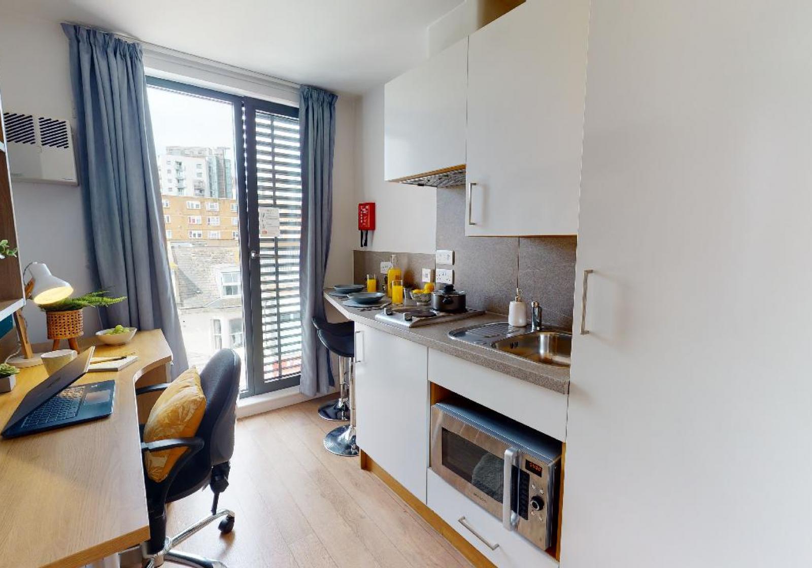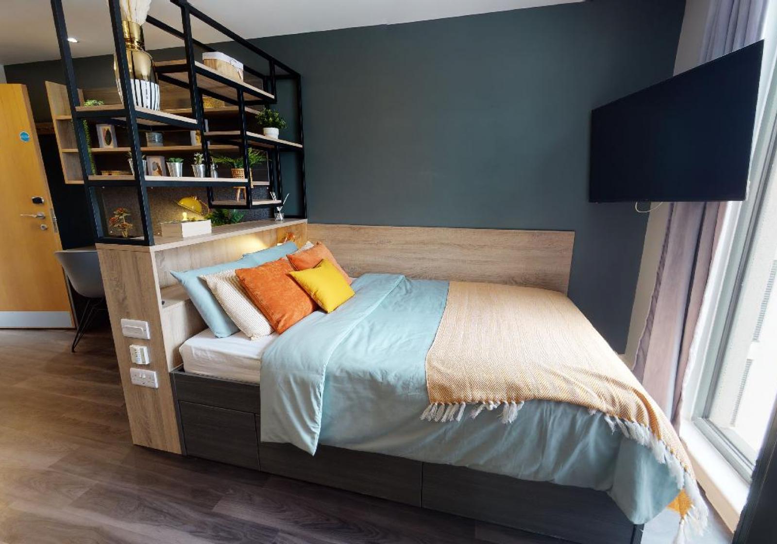 Our fully refurbished Gold Studio Plus gives you an impressive 21-25 sq m of living space, equipped with its own kitchenette, shower room, bed, study area and plenty of storage.