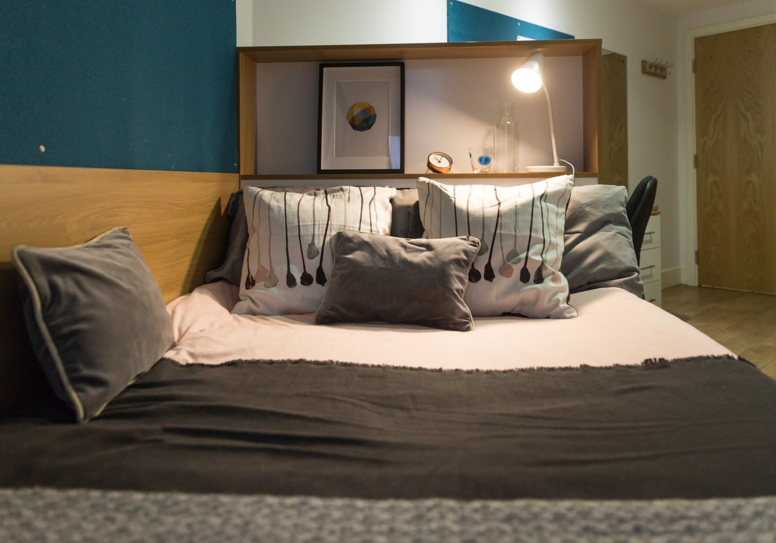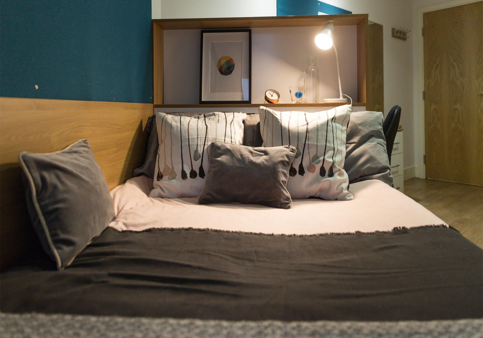Our Bronze En Suite is a great entry-level choice. You have a small double bed, storage and study space, plus the use of a kitchen and living area shared with up to four others.
