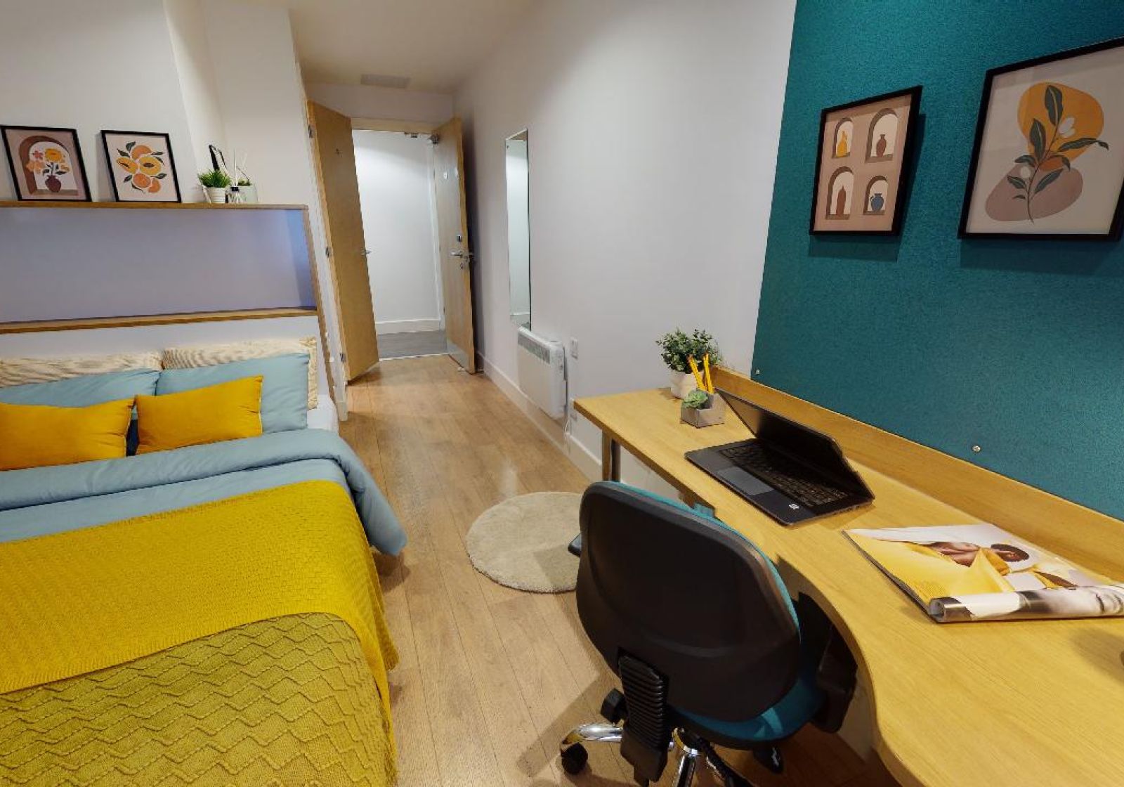 With a unique layout but the same amount of space as a Bronze En Suite, our Copper En Suite offers excellent value. With a small double bed, storage and study area, you have all the essentials.