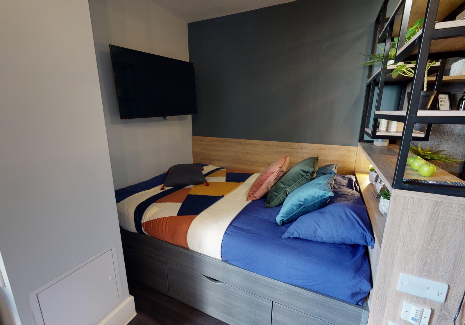 A Gold En Suite a great choice if maximum space is your priority. This room includes a small double bed, storage and a study area, and you'll share your kitchen and living space with up to four others.