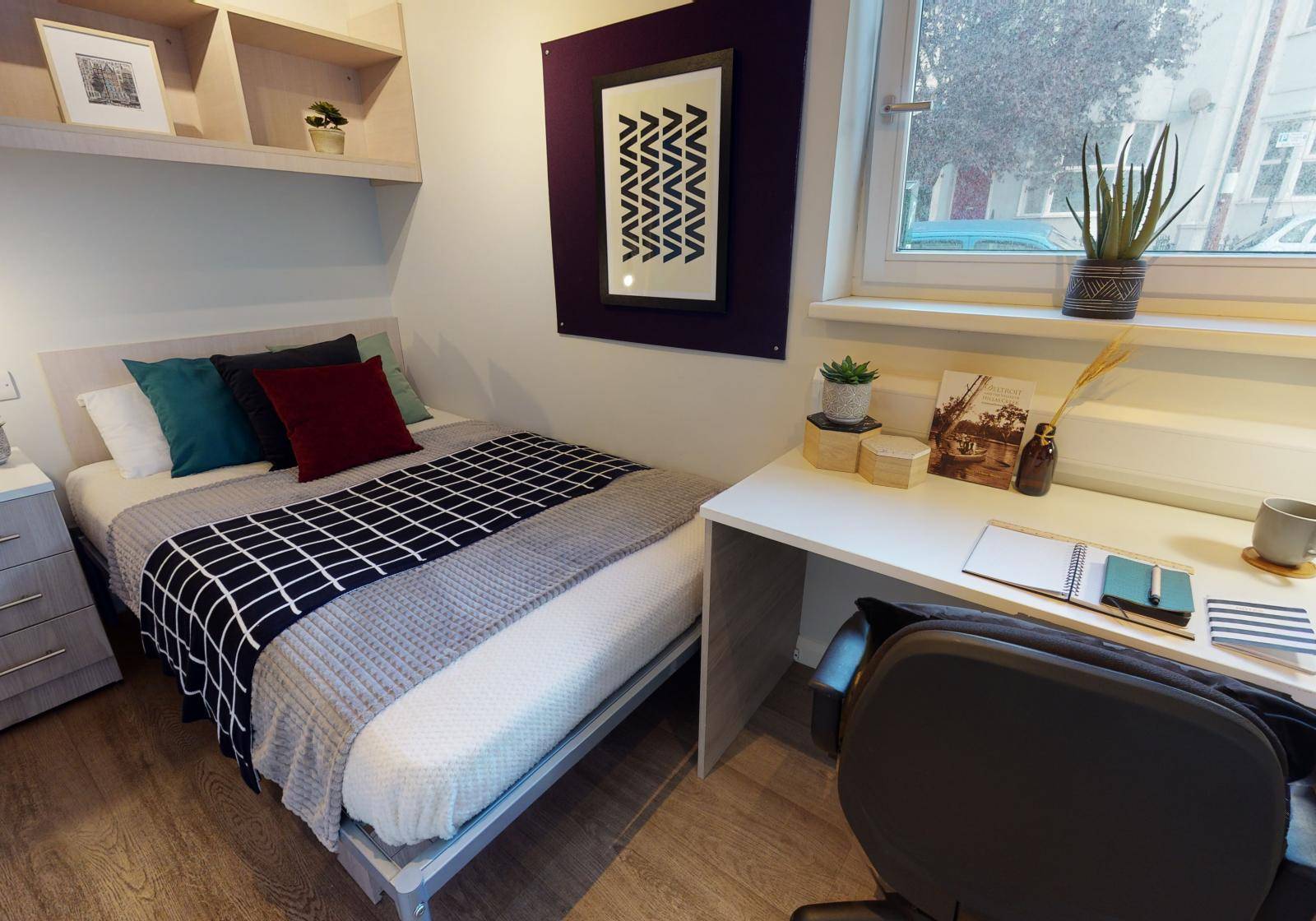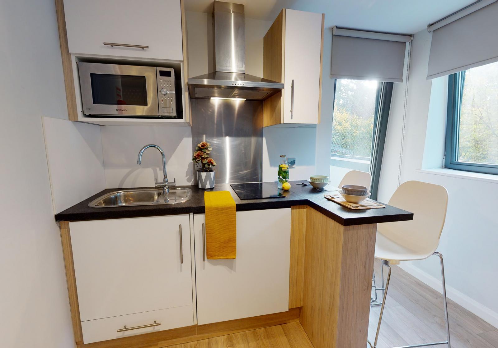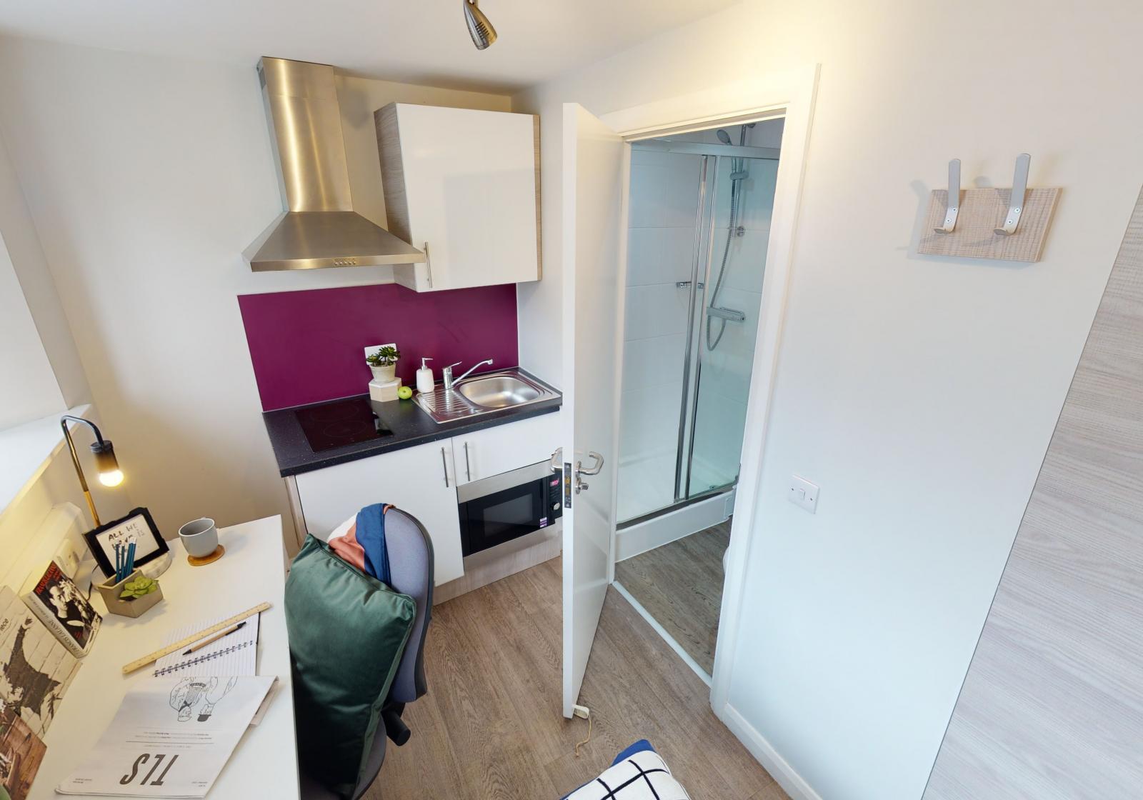 Our Accessible Gold Studio is located on the 1st floor with 17-18 sq m of living space. The room comes with a double bed, private kitchen, wardrobe, study area, call points and an accessible en suite shower room.
