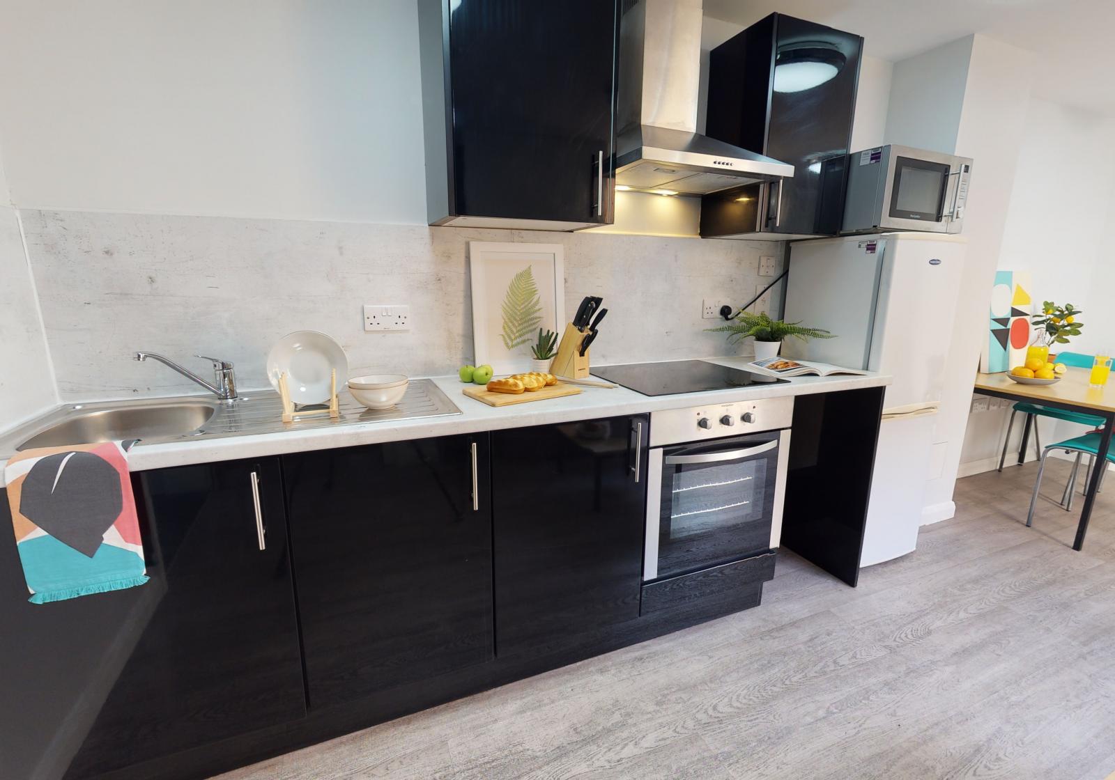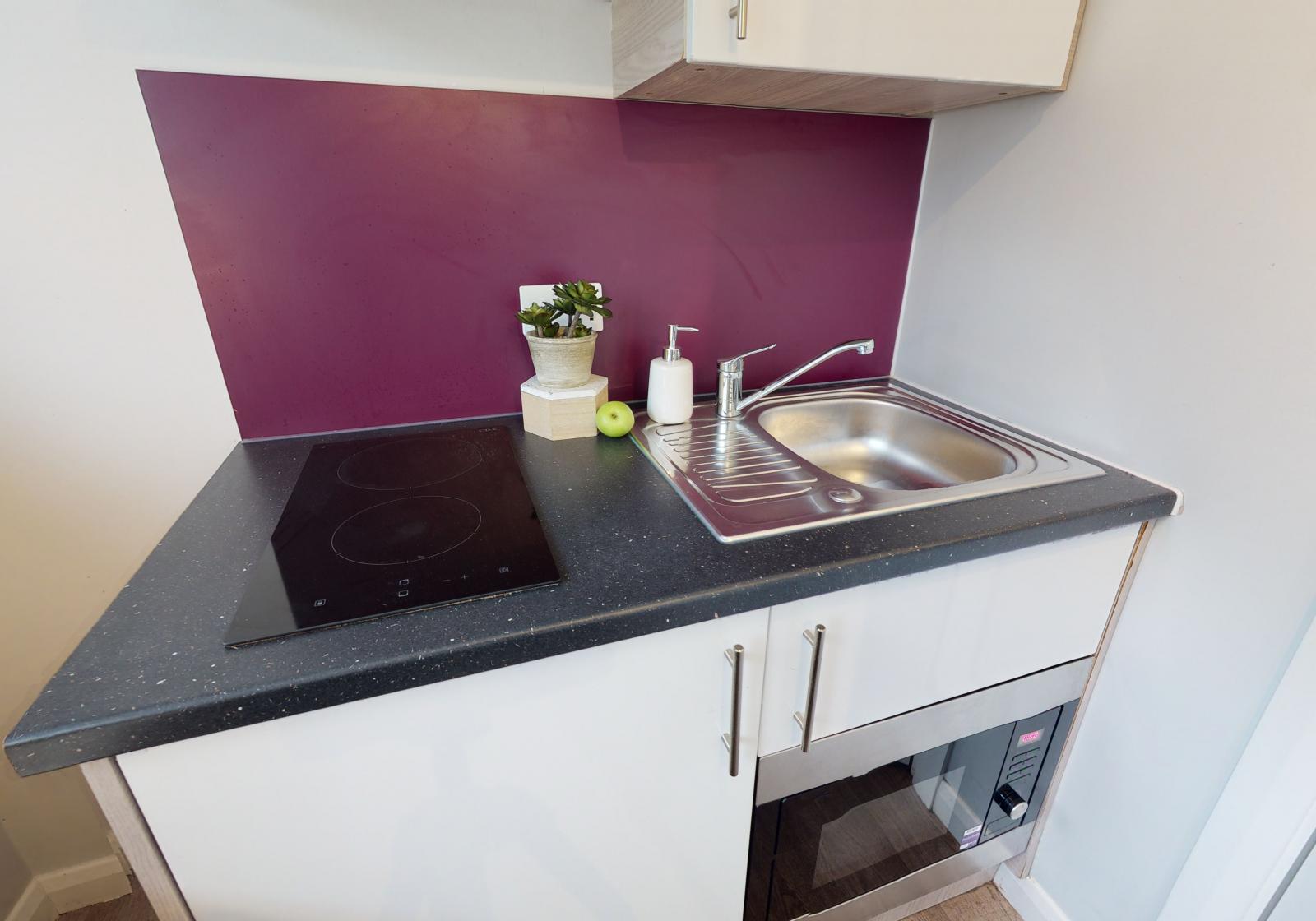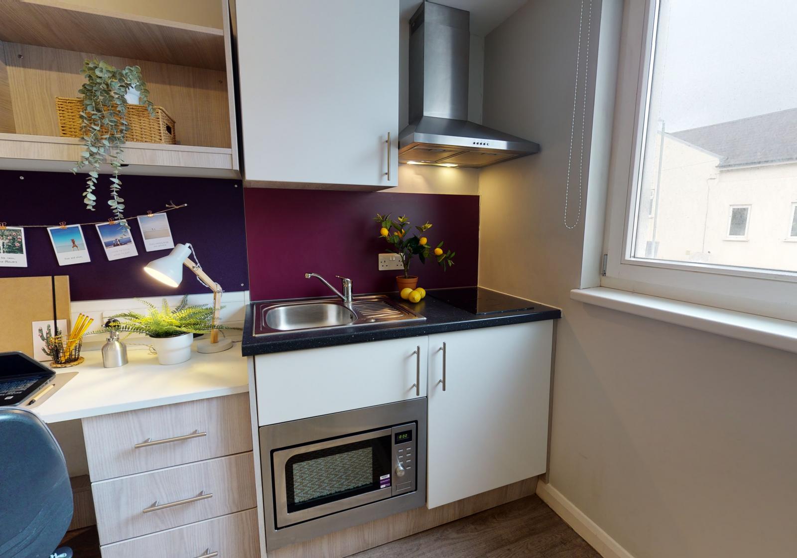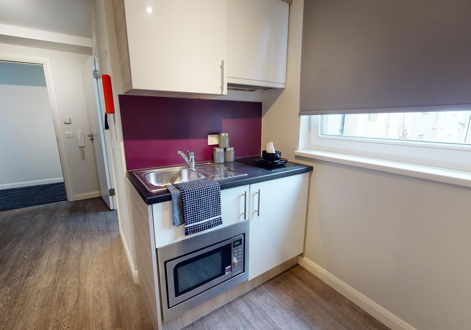 Our Accessible Gold Studio is located on the 1st floor with 17-18 sq m of living space. The room comes with a double bed, private kitchen, wardrobe, study area, call points and an accessible en suite shower room.