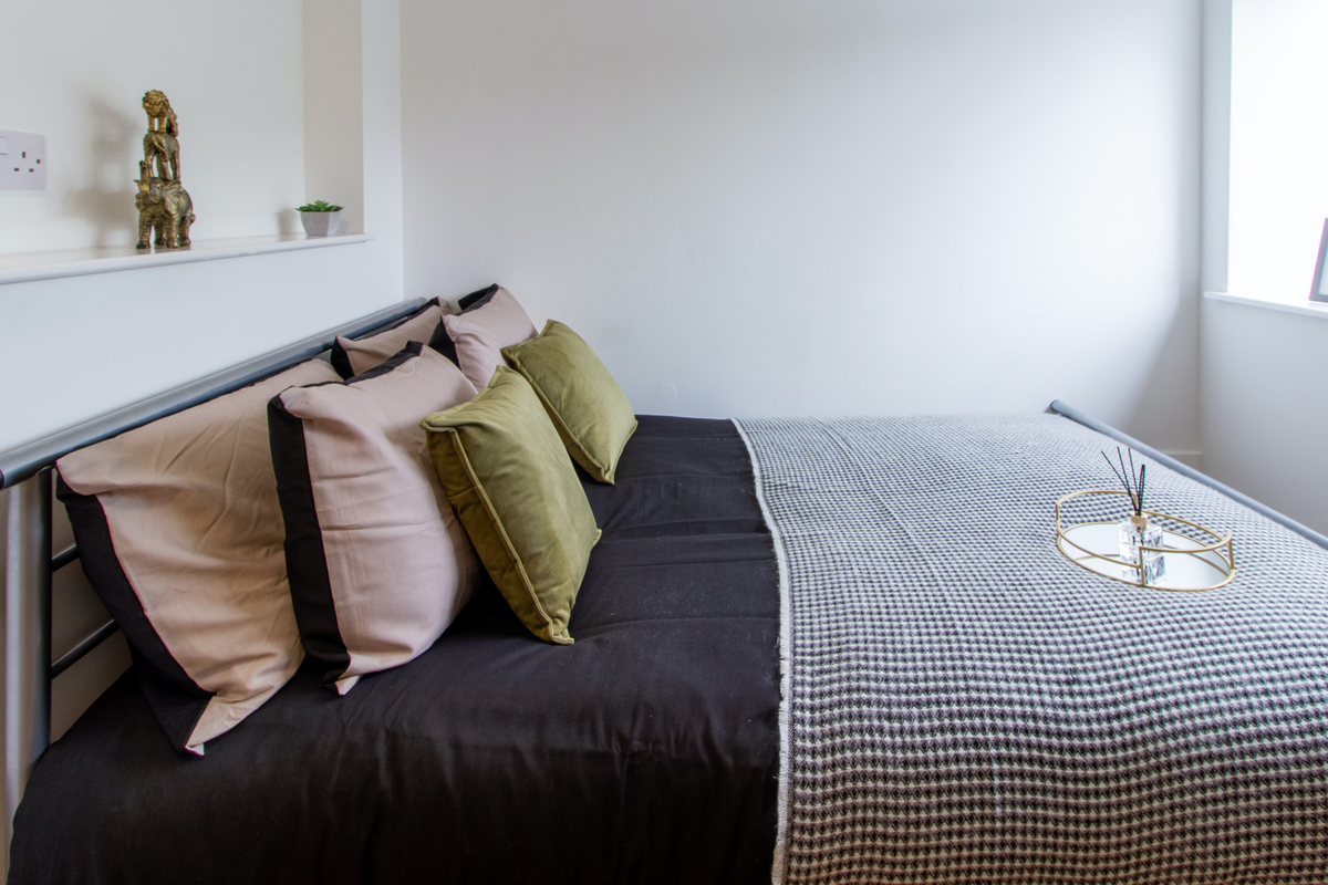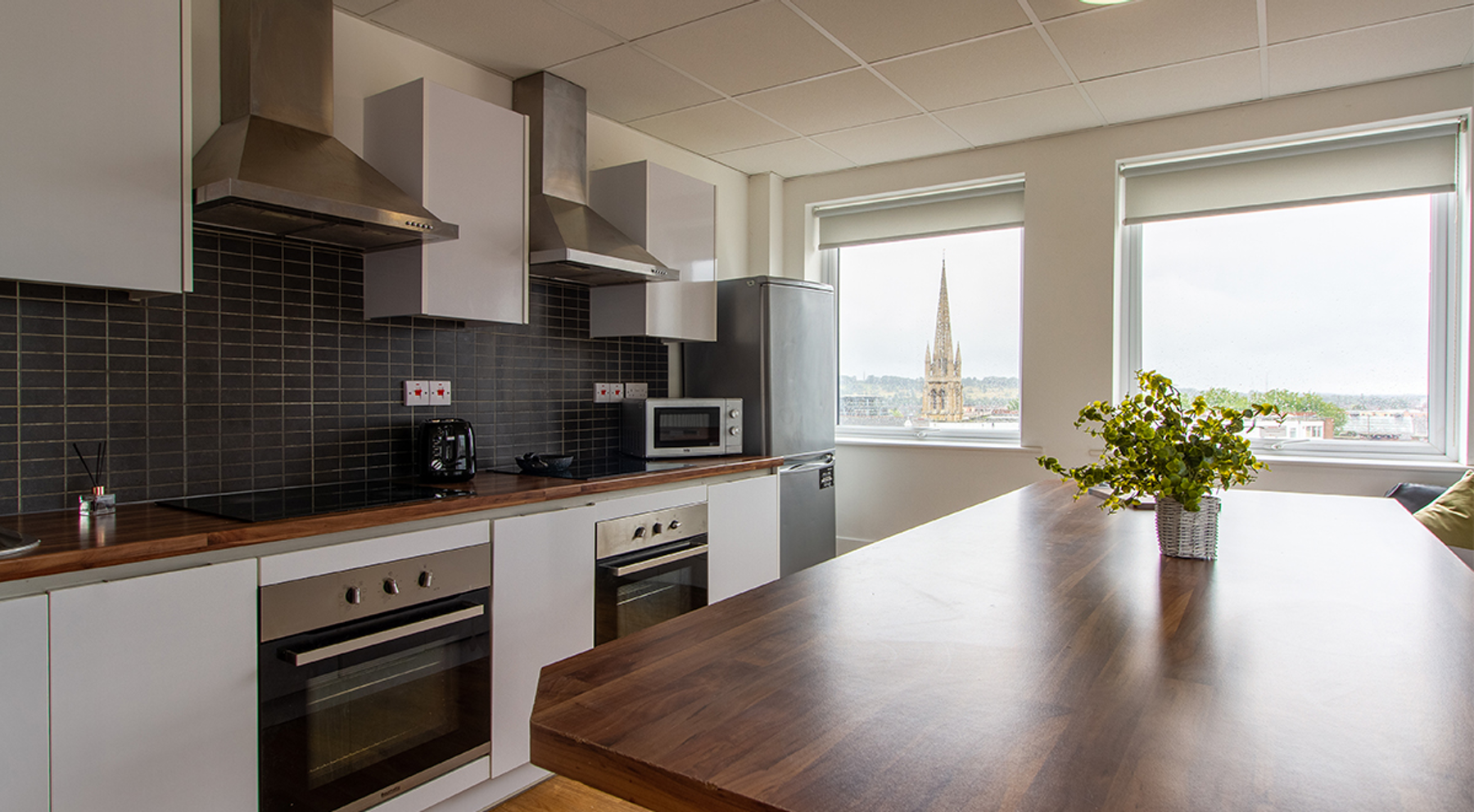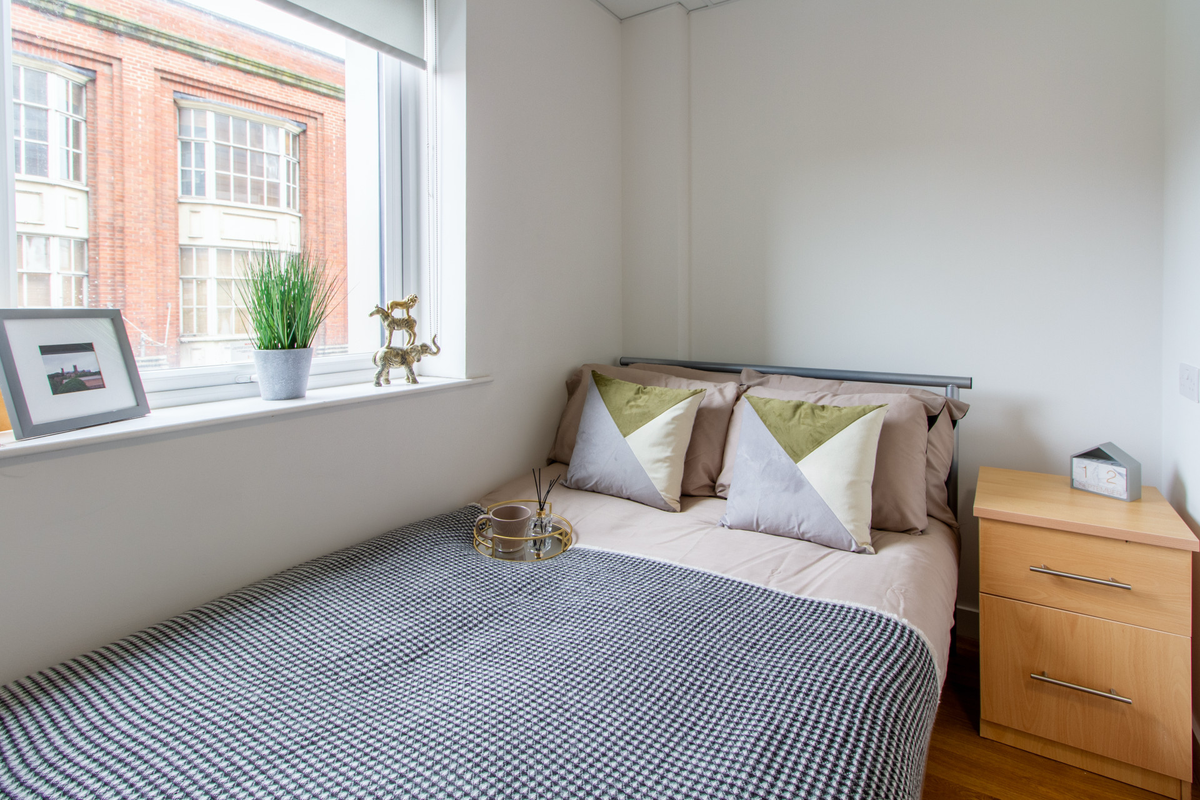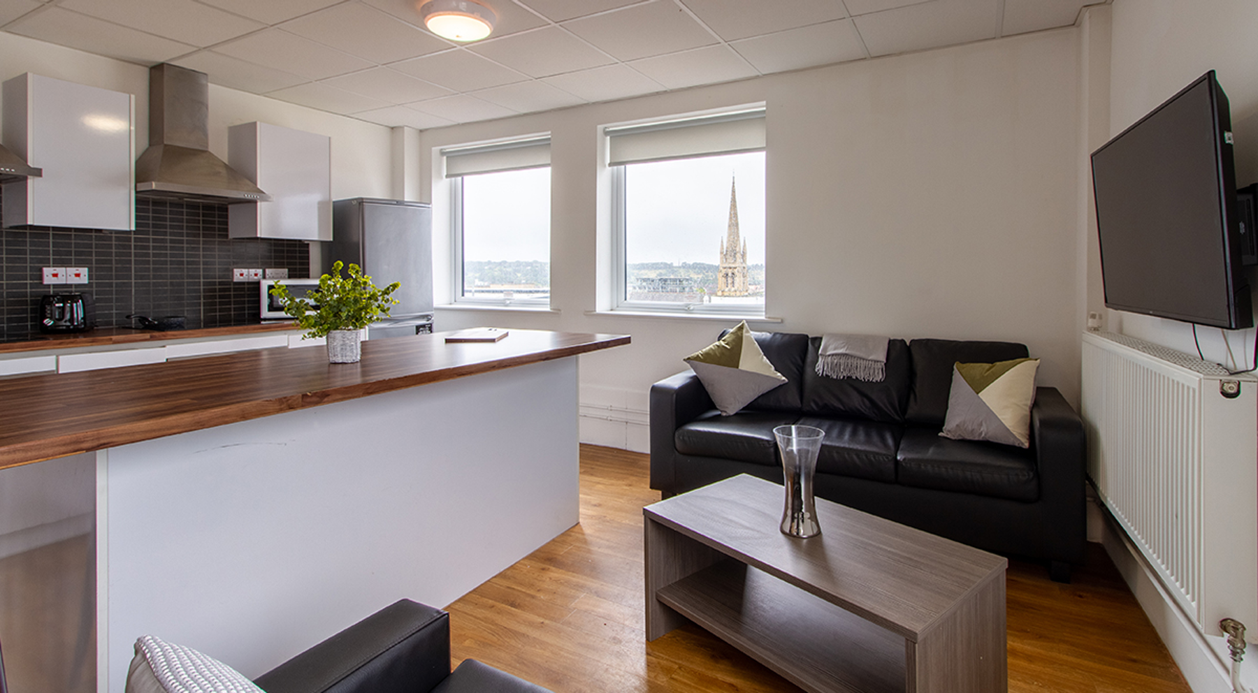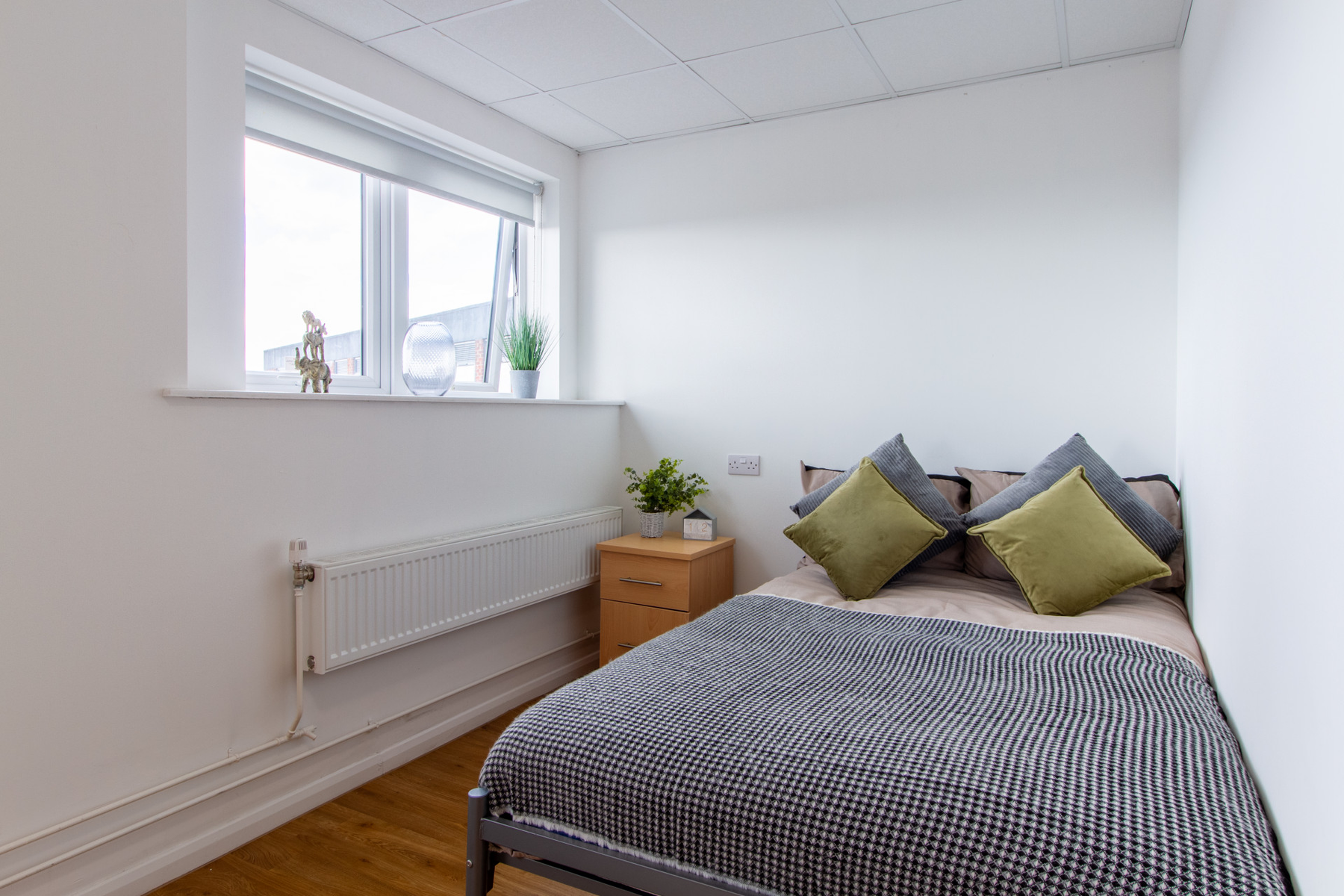 En-suite room with ¾ sized beds, storage and study space. En-suite bathroom. The average room measurement is 14m². Large communal kitchens within the flats that provide cooking and seating facilities along with a TV lounge area. Up to 100Mbps WiFi is available throughout the property.