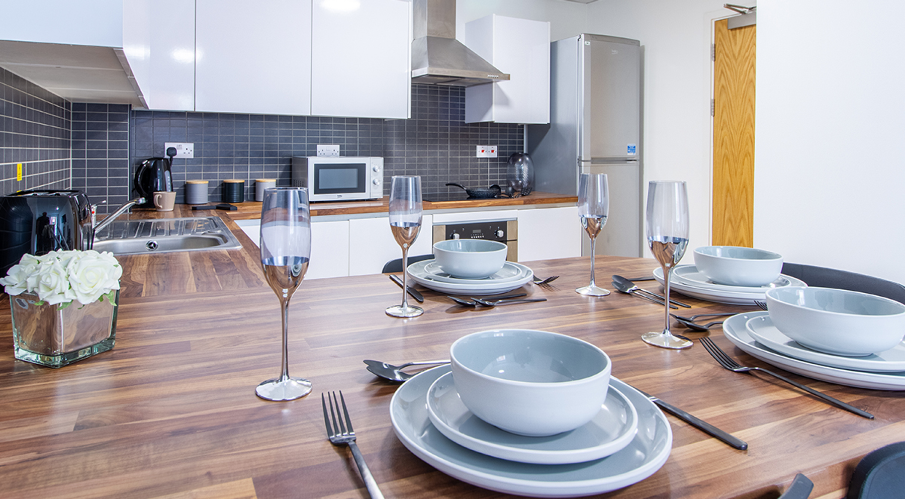 Intimate four bedroom space, bedrooms measuring 22m² with ¾ sized beds, storage and study space. En-suite bathroom. Up to 100Mbps WiFi is available throughout the property. Modern kitchens that provide cooking and seating facilities along with a TV lounge area.