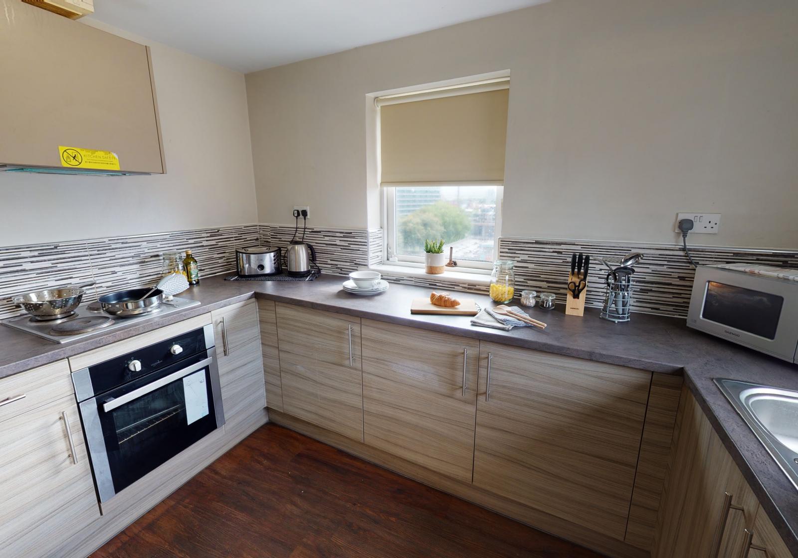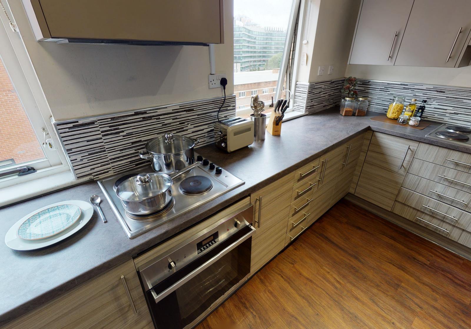 Your bedroom comes with double bed, study area and lots of storage. You and your housemates will be sharing your spacious living area with sofas, bathroom and well-equipped kitchen and you’ll also benefit from the building’s cinema, gym, laundry and karaoke and games room.