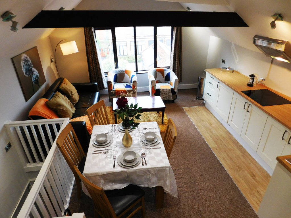 The apartment is located in a grade two listed building on the second floor with no lift. This a large apartment with a king-size bed on one side of the room and on the other side is a lounge area with a kitchen and dining table. A large shower room comes off the sleeping area. The main window in the room overlooks the private enclosed courtyard. The Colegate area encompasses Magdalen Street, which is the primary northern exit from Norwich and the shopping centre for the old town on the other side of the river Wensum. The area comprises small lanes crisscrossing larger streets running North and South. These essentially continue the medieval street pattern of older city centre streets, but with large old factory buildings and townhouses dominating the landscape.