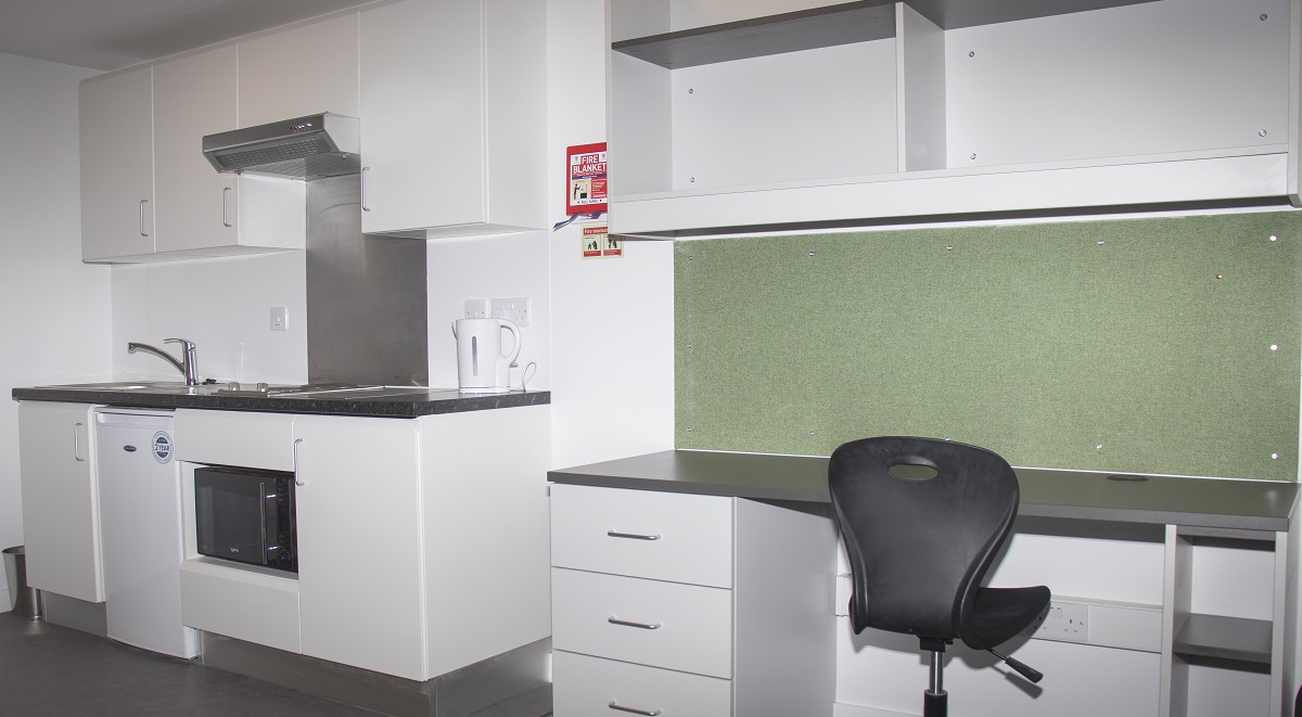 This larger luxury studio comes with a double bed, fitted wardrobes, study desk and chair, plenty of storage, and your own modern en-suite bathroom. There is also a private kitchenette which includes a fridge/freezer, combined microwave and mini grill oven, hob, kettle, toaster and vacuum.