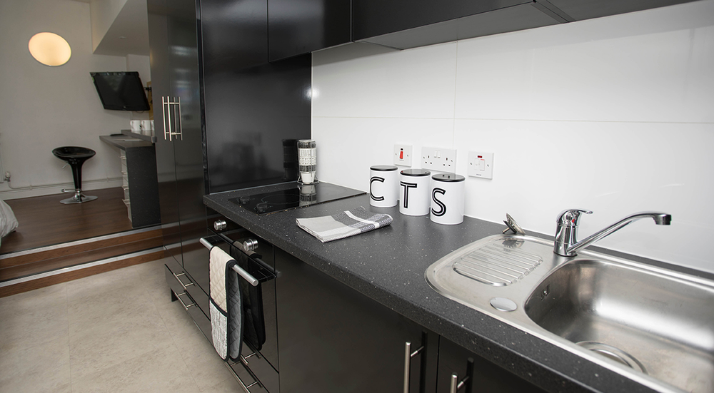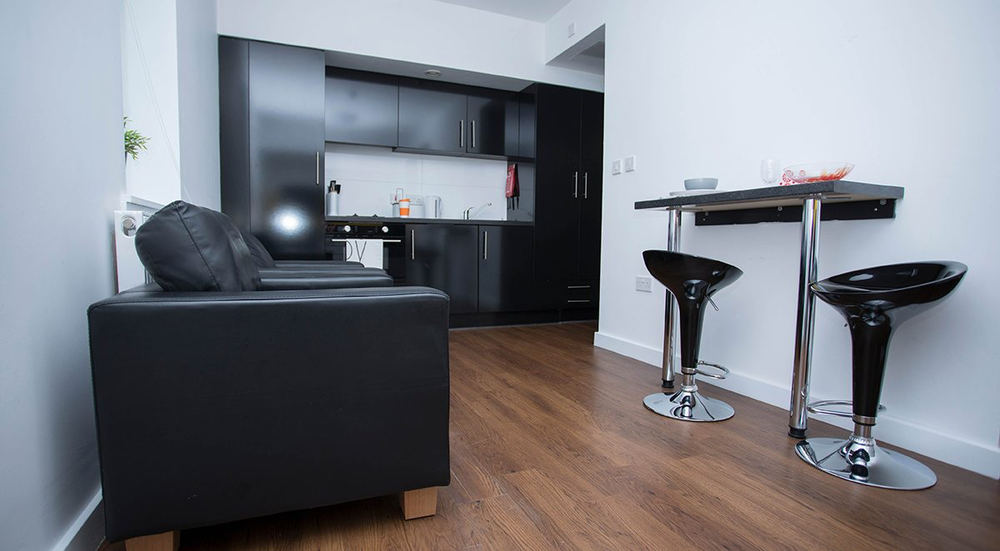 Stylish studio measuring around 14-18m², ¾ fixed bed with under bed storage, kitchenette, en-suite shower room, study area, double wardrobe, TV and up to 100mbps WIFI throughout.