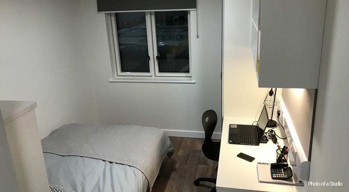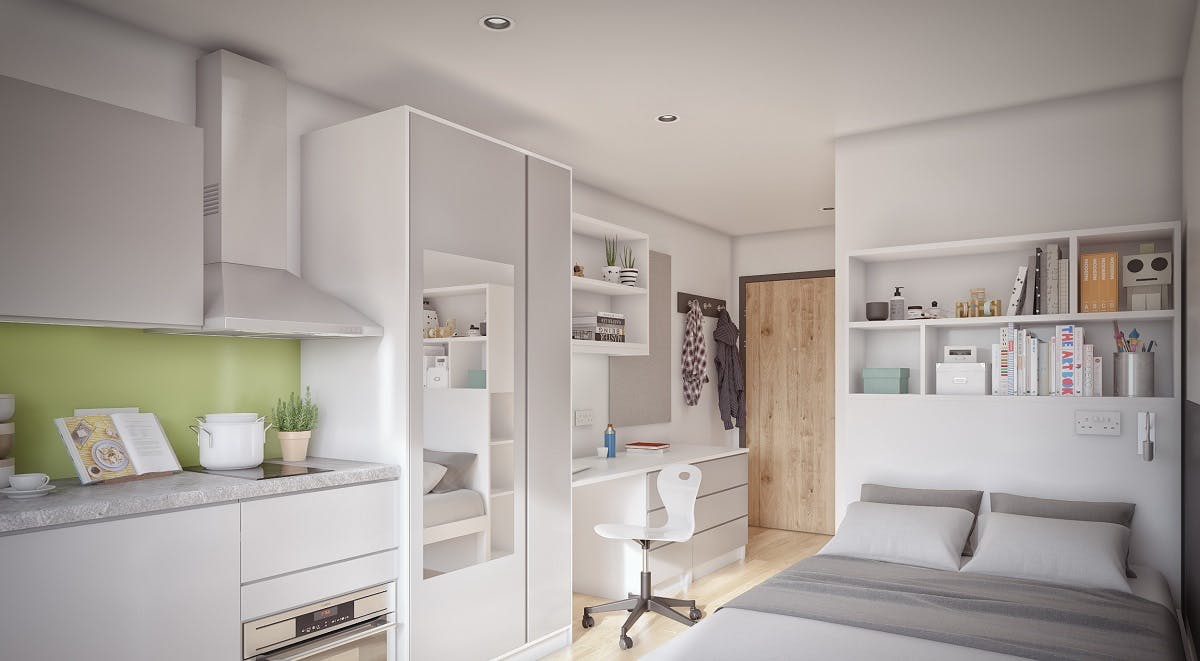 There is up to 200Mbps WiFi provided across Plymouth Cross House, as well as a community eating space, onsite cinema, and games room. All rooms offer a wide, comfy bed, a workspace, lots of storage, and luxurious en-suite bathrooms. Each studio has its own contemporary, well-equipped kitchen.