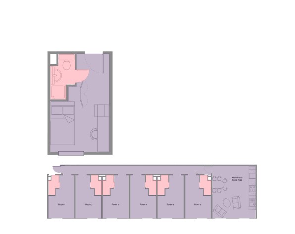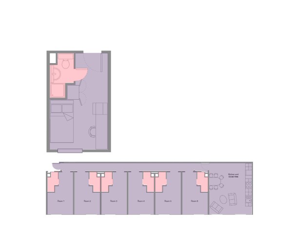 The fully furnished bedroom and living area offer ample storage and natural light. All bedrooms include a 3/4 bed, study space and wardrobe. The kitchenette comes equipped with hob, microwave and undercounter fridge with freezer compartment.