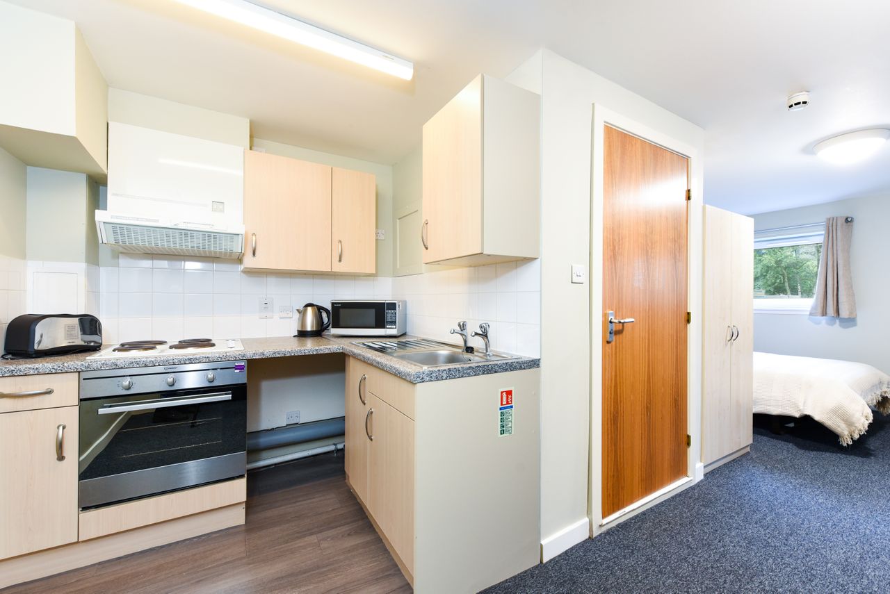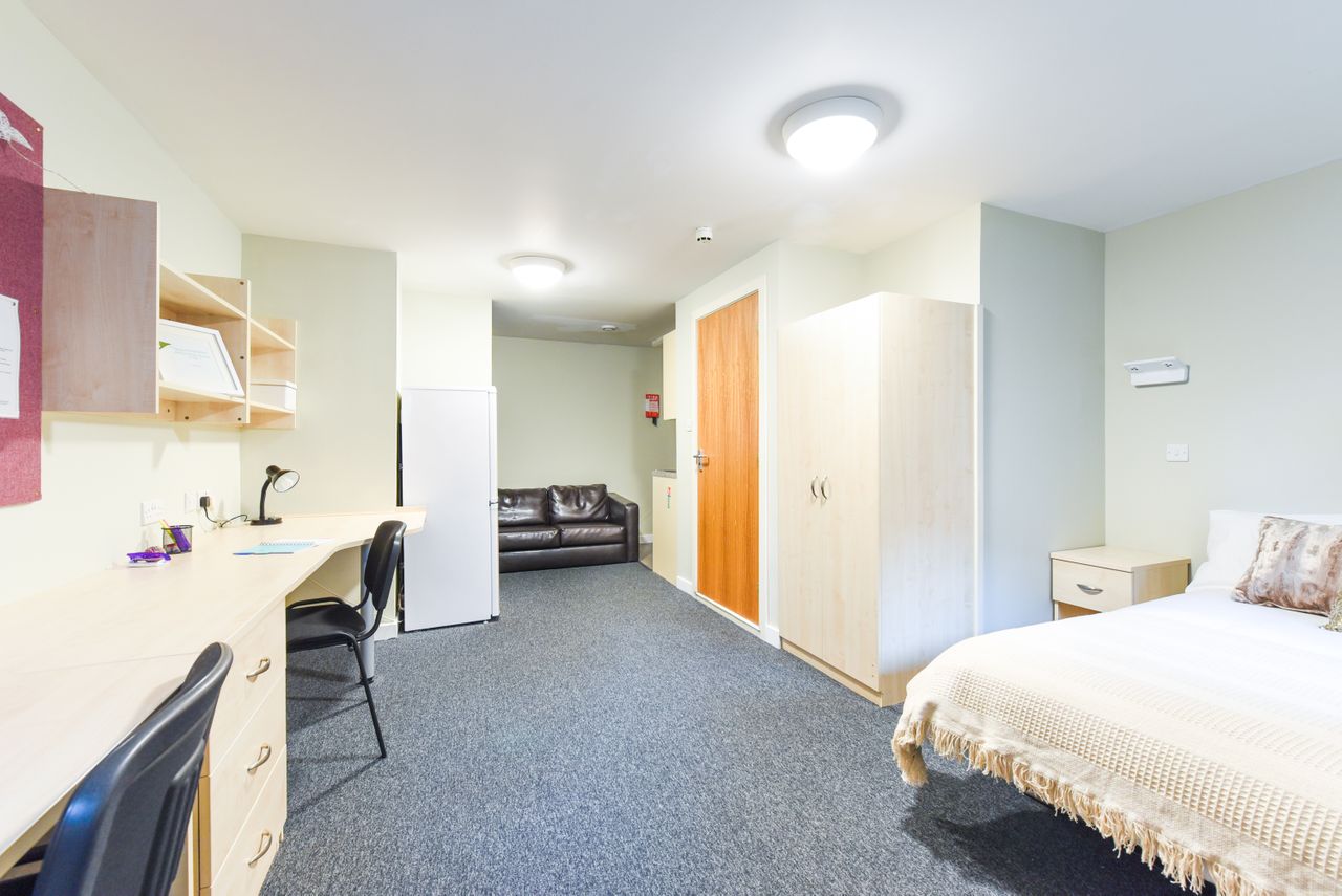 Self-contained studio bedroom with own kitchen and bathroom, Under-bed storage, desk, chair, wardrobe and chest of drawers included in the room. Dual-occupancy available at no extra cost.