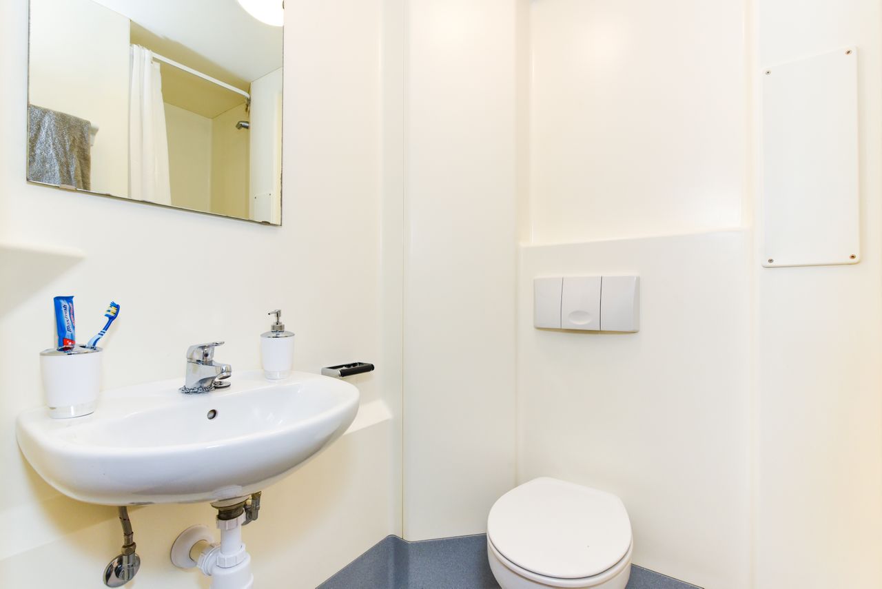 Communal kitchen and living space with up to 6 ensuite rooms per flat, Ensuite bathroom with shower, toilet and basin.