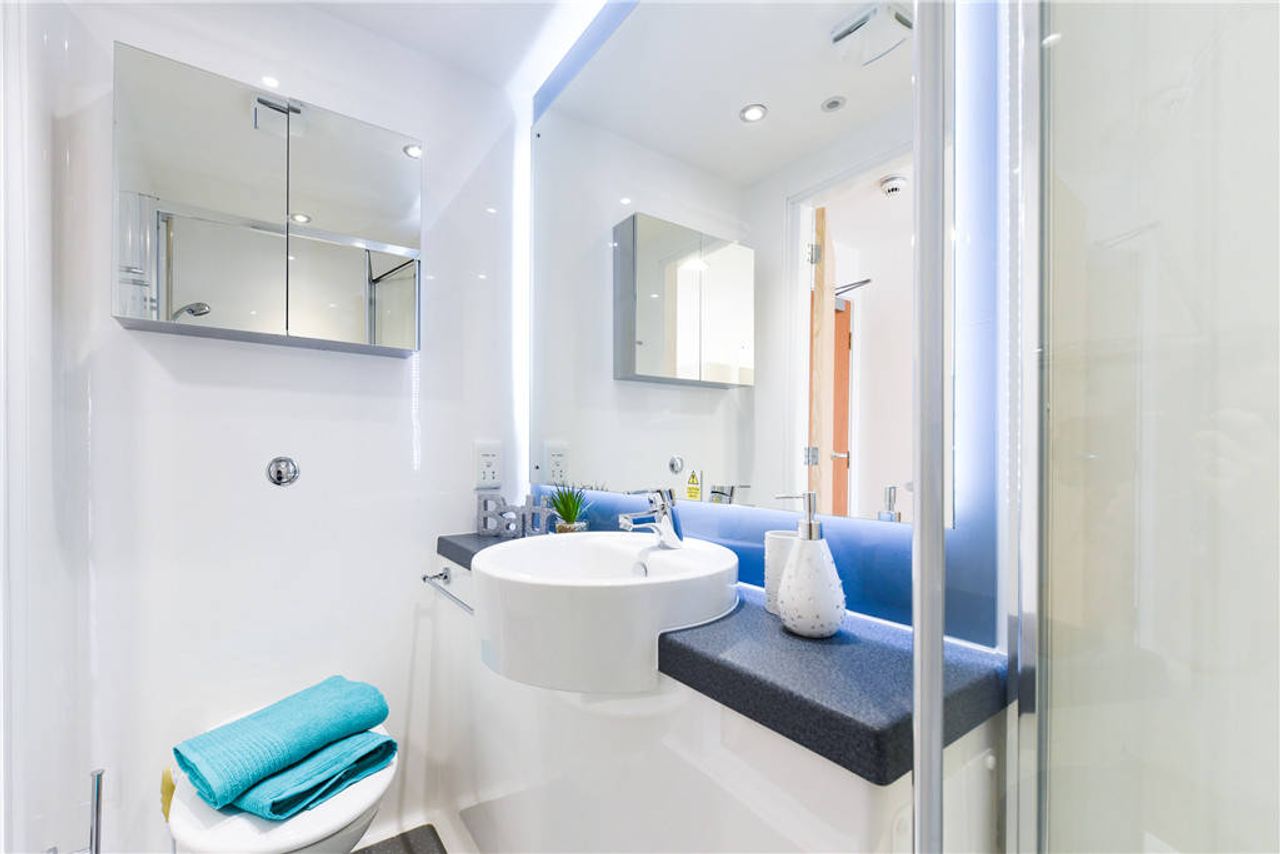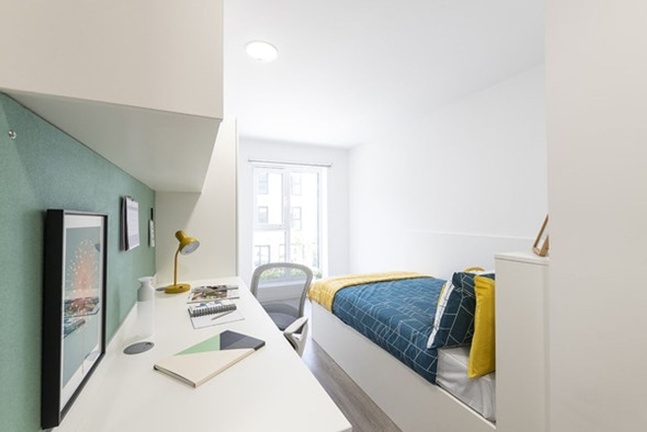 Ensuite room with communal kitchen and living space with up to 6 ensuite rooms per flat. A floor area of 10.2-10.8m², small double bed, under-bed storage, desk, chair, wardrobe and chest of drawers included in the room