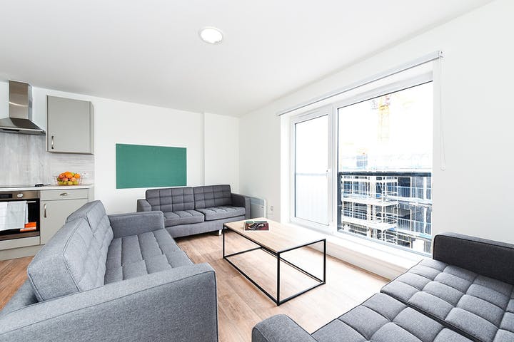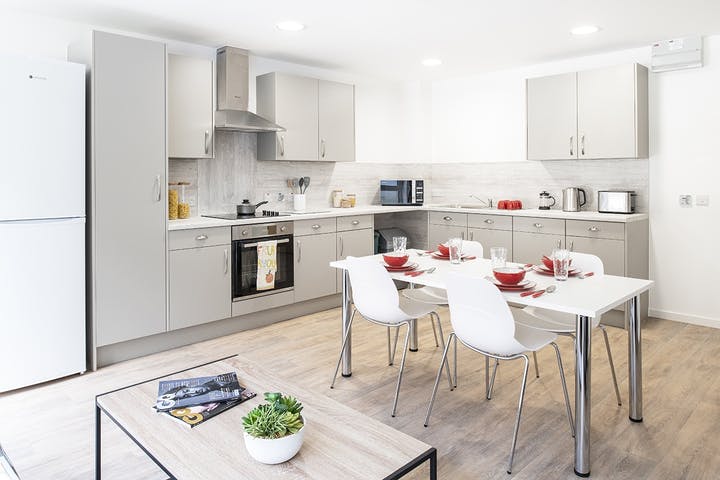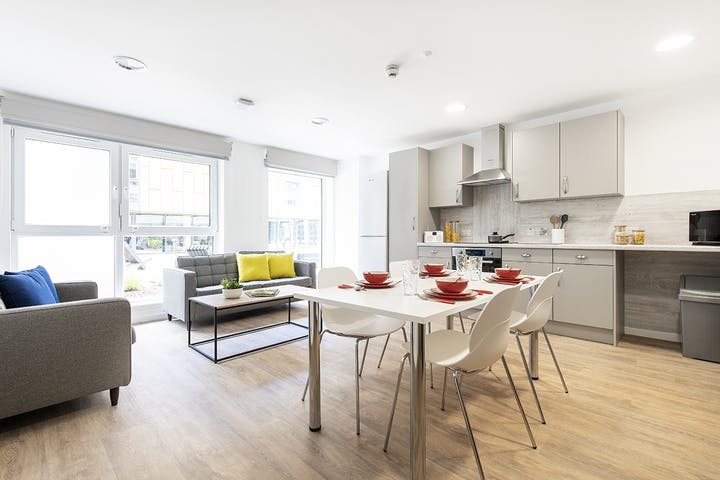 Communal kitchen and living space with up to 9 ensuite rooms per flat, Under-bed storage, desk, chair, wardrobe and chest of drawers included in the room.