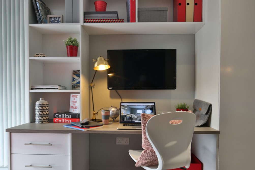 You’ll always get a bed, desk, chair, bookshelves, wardrobe, and plenty of storage.