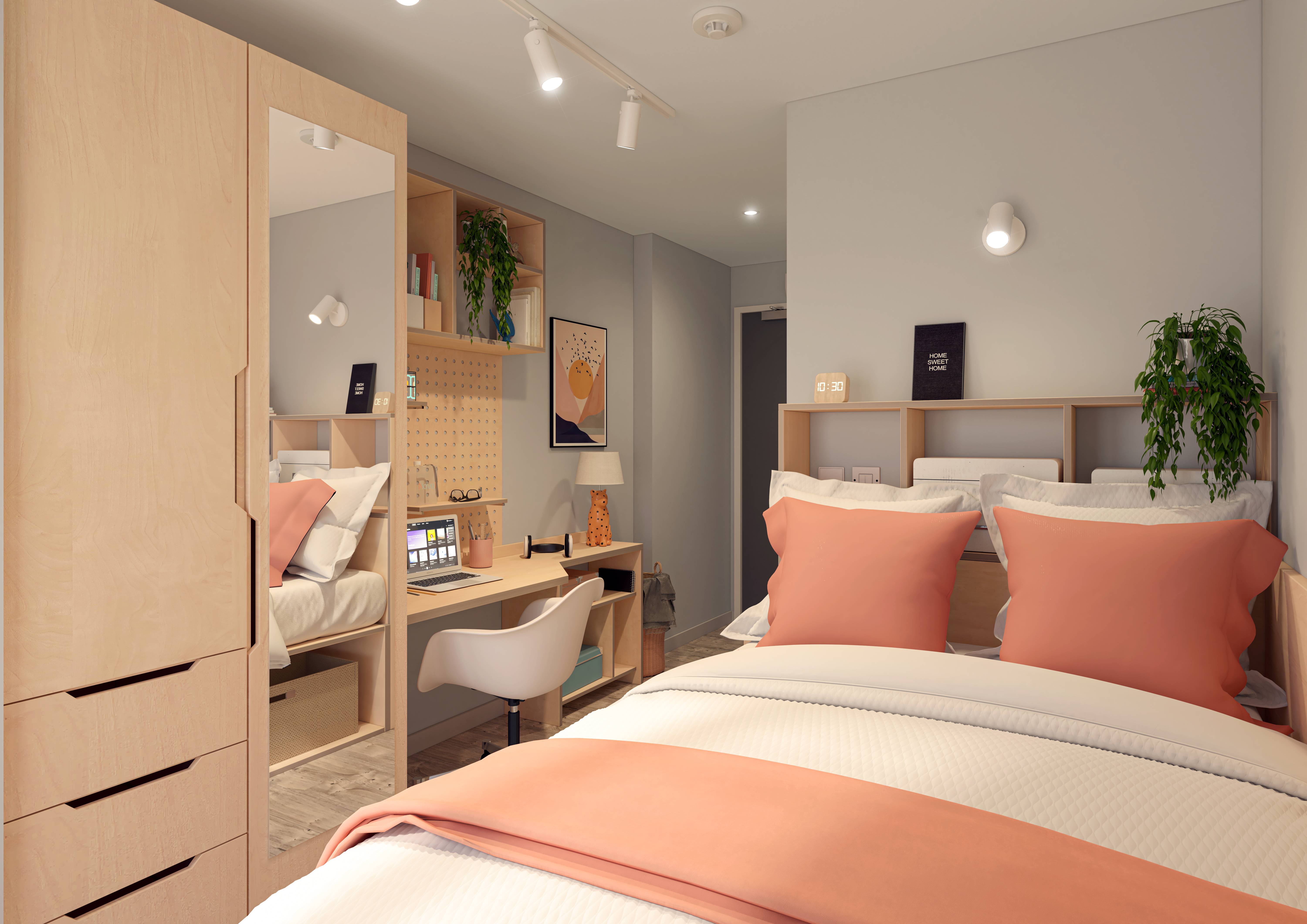 The apartments at Alma Place are self-contained, perfect if you want extra privacy, have their own bathrooms and have lots of storage. The en-suite apartments offer a communal living area with a sofa and 50-inch Smart TV, a dining area, a fully equipped kitchenette, and washer-dryers for people wishing to share with friends or meet new flatmates.