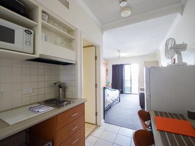 UniLodge Shafston features standard studio apartments and short stay accommodations. The room has many facilities including air conditioning, alarm clock, stove, twin bed, shower, tables and chairs, and a ceiling fan.