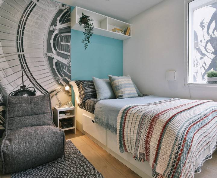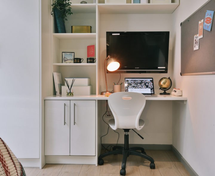 You’ll always get a bed, desk, chair, bookshelves, wardrobe, and plenty of storage.