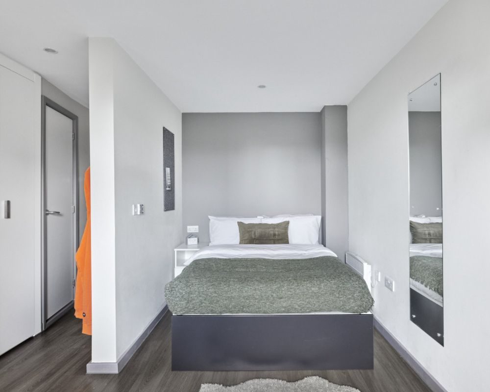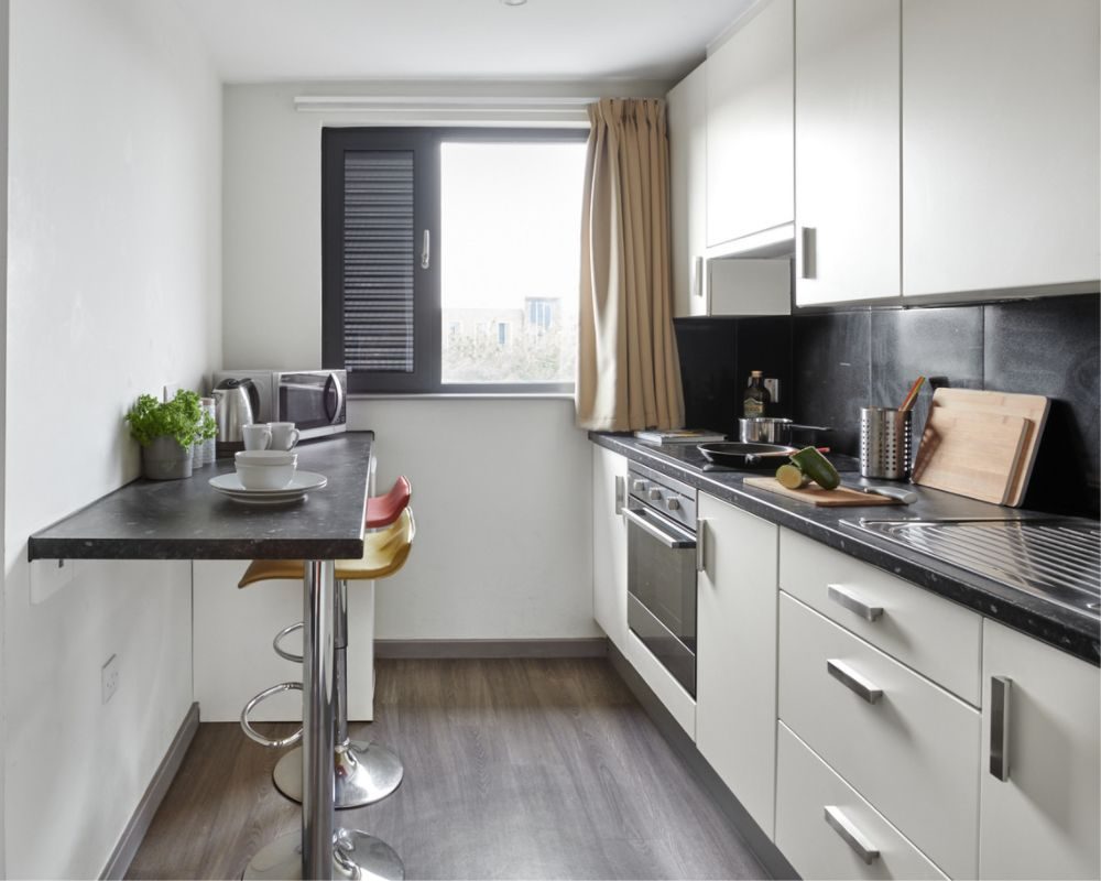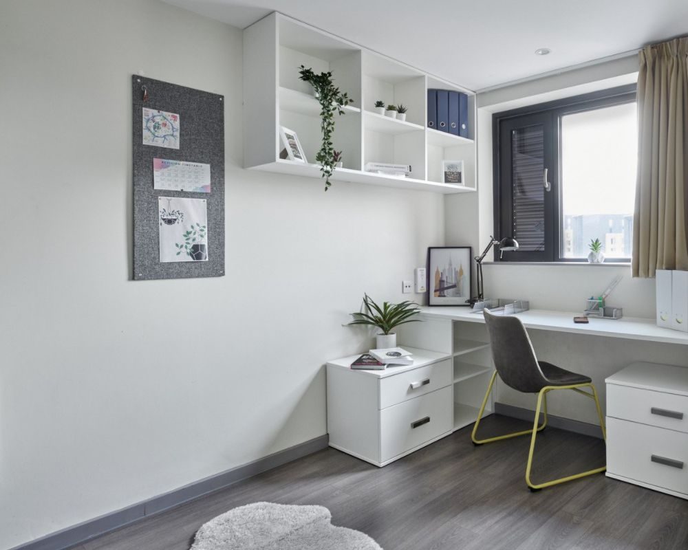 Our studio rooms are perfect for students looking for more privacy. You will have your own en-suite bathroom and fully fitted kitchen, as well as a comfortable bed, a wardrobe, plenty of additional storage for your belongings, and a Wi-Fi connected study space.