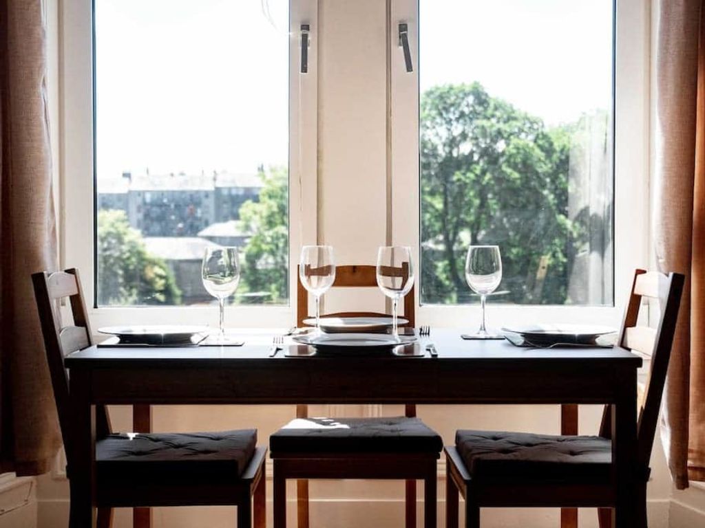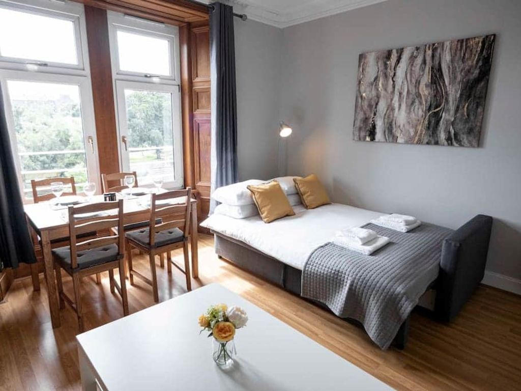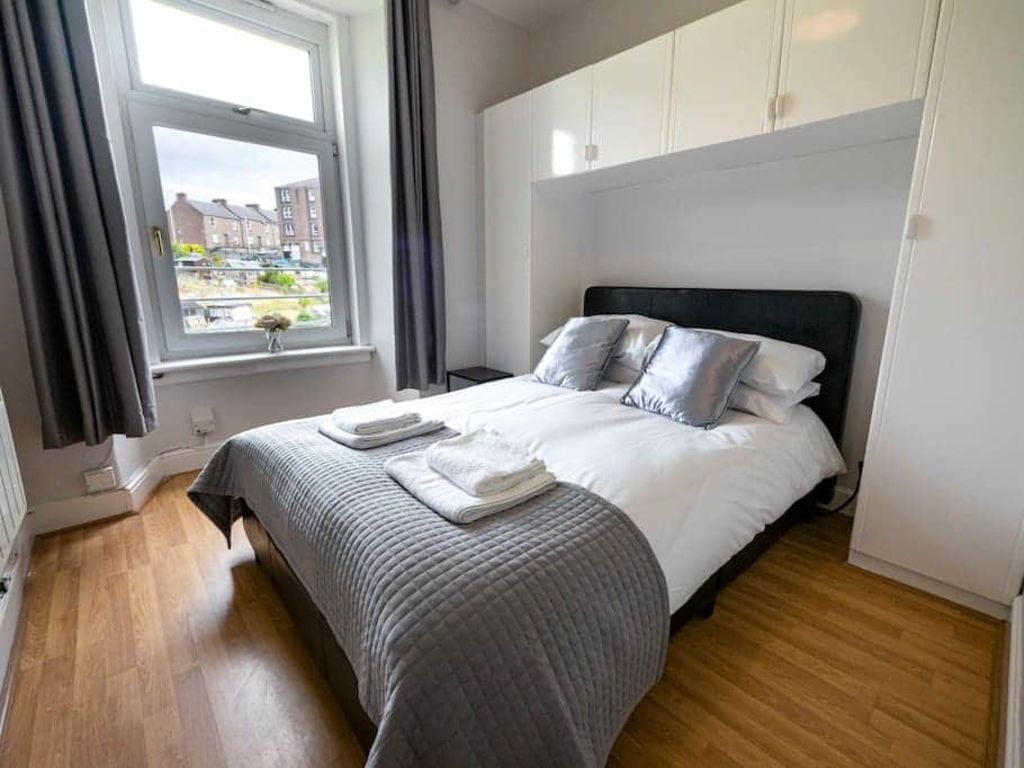 This bright, spacious apartment is within walking distance from the Dundee University Campus, V+A Museum and the city’s most popular cafés, bars, restaurants. Pleasantly decorated and fully furnished, this apartment provides an ideal location for a stay in Dundee, Scotland. Suitable for long or short stays, the accommodation comprises of; a large lounge with plenty of space to re-lax, double bedroom with plentiful storage, kitchen and shower room. . The large sofa in the lounge easily folds out into a full size double bed (as seen in the photos) to sleep a third and fourth guest, while the dining table looking out towards Dundee also doubles as an open and bright workspace. The perfect accommodation for both residential and corporate guests. Especially useful for long terms guests, there is a washing machine and drying rack for you to use and (since a lot of people ask) you are welcome to use the vacuum cleaner if you want to. There is a well-lit stairway up to the apartment and being a quiet residential block you are guaranteed a comfortable stay. Given this, noise must be kept to an acceptable level in the apartment and stairwell at all times. Please note, this flat is on the third floor. There is a Double bed and large fitted wardrobe in the main bedroom. Also, have a great time in Dundee!Notice: Displayed prices and data are not final, and should be used for informative purpose only. They are not contractual or binding. Energy pass This building is not subject to EnEV.