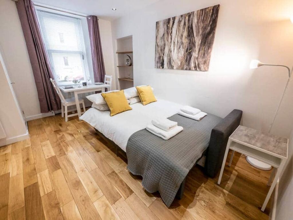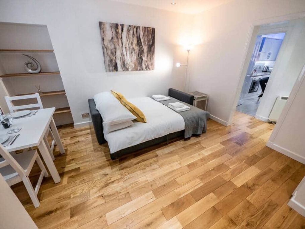 This modern, ground floor studio in Broughty Ferry is just one street away from the stunning Tay Estuary. Fully furnished, and with a full size double fold out sofa-bed, this property offers plenty space for up to two people. The Studio provides an ideal location for a stay in Broughty Ferry, Scotland. . Suitable for long or short term stays, the accommodation comprises of; a large kitchen for a property of this size, modern bathroom, and lounge which doubles as the bedroom. The large sofa in the lounge easily folds out into a full size double bed (as seen in the photos) while the dining table doubles as an open and bright workspace. There are two large cupboards offering plenty of storage space and for hanging clothes. The perfect accommodation for both residential and corporate guests. There is a well stocked kitchen to cook your favorite meals (inc. washer). All bed linen, towels, Unlimited Wifi, utilities etc are included for your stay. Notice: Displayed prices and data are not final, and should be used for informative purpose only. They are not contractual or binding. Energy pass This building is not subject to EnEV.