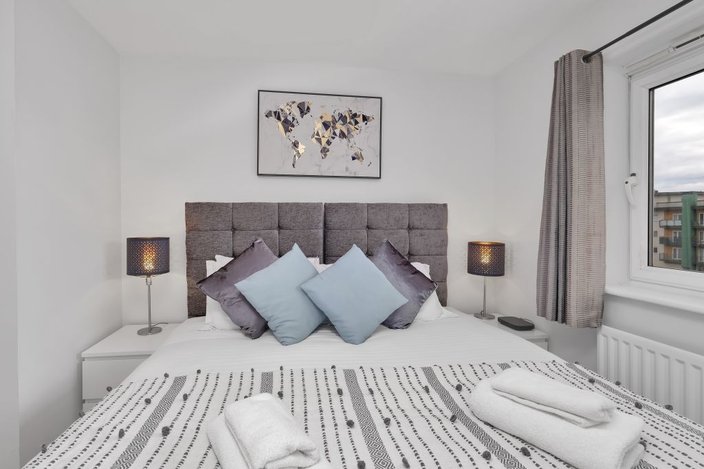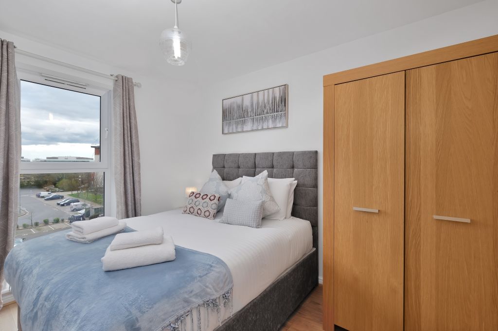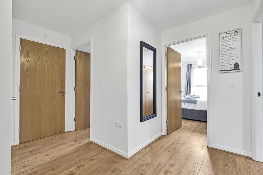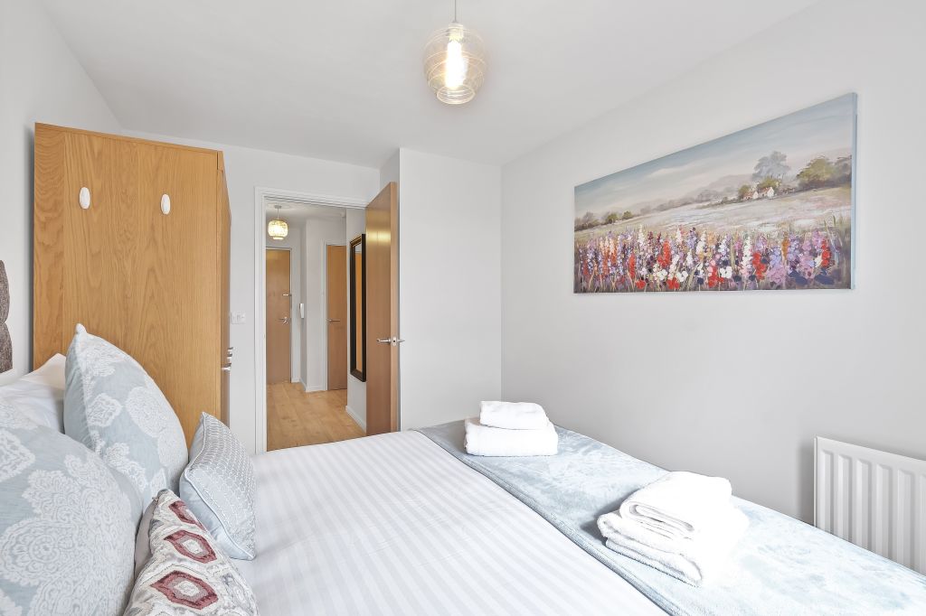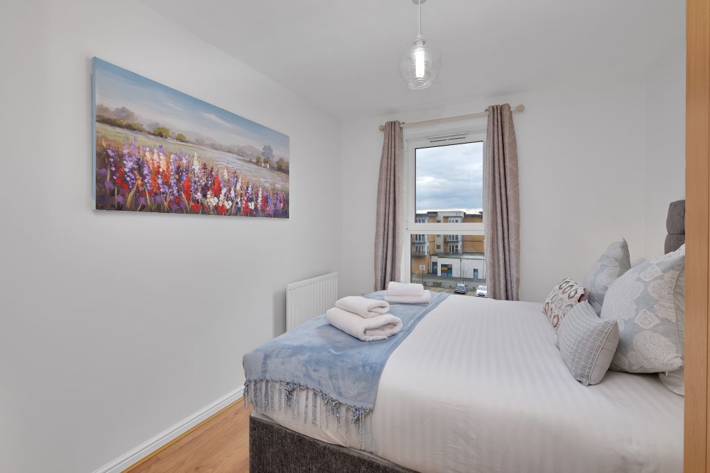 Two bedroom two bathroom apartment with free, secure parking and WiFi. The living room has comfortable seating including a sofa bed, plus a dining area with table and chairs. We provide a Smart TV with internet connection so you can log into your Netflix or other services.The kitchen is of course fully equipped including Fridge/Freezer, Washer, Microwave, Kettle, Toaster, etc as well as utensils, crockery etc.For sleeping, the main bedroom has a super king-size bed plus wardrobes and bedside table etc. The second bedroom has a 2 single beds and wardrobe and bedside tables. The bathroom comprises shower over bath with sink and toilet.Parking for cars and small vans is within the grounds. Located across the road from the Galleria shopping centre with lots of shops, restaurants and coffee shops. The locations also provides easy access to the M25 and the M1 motorways.”