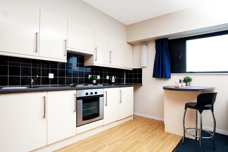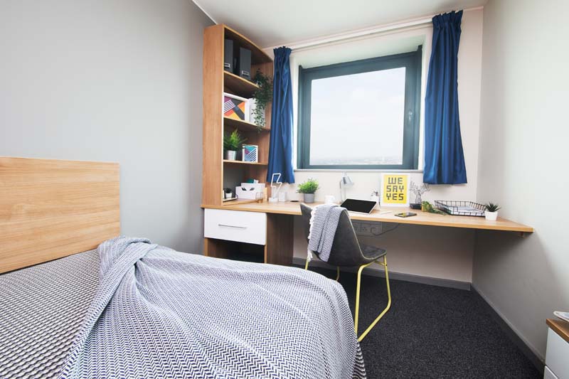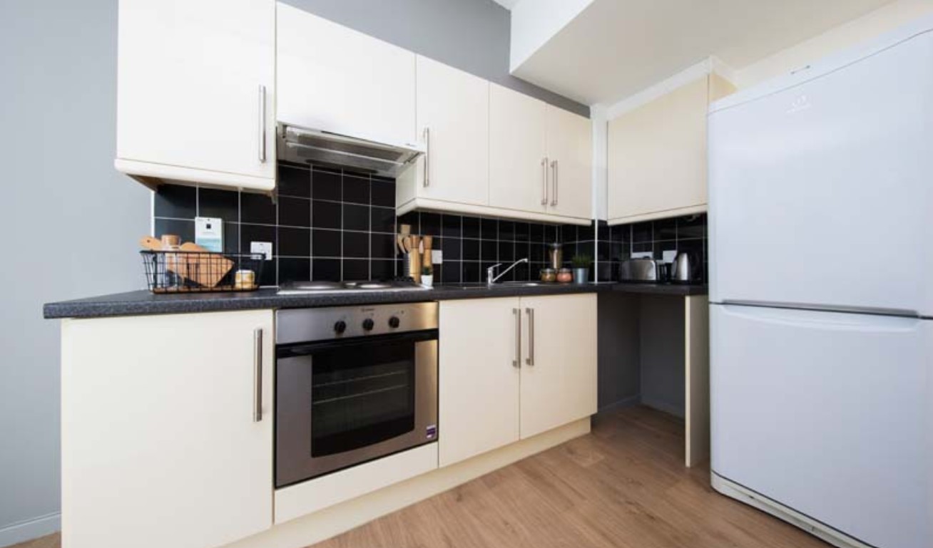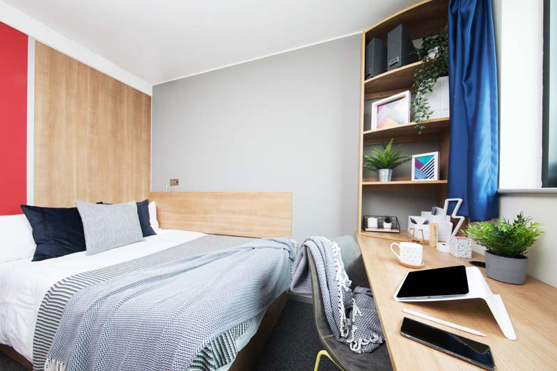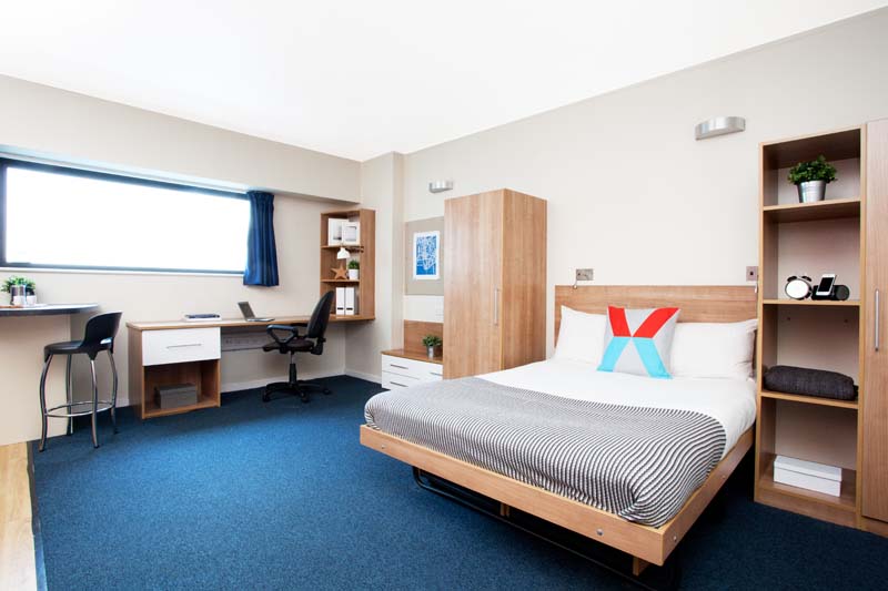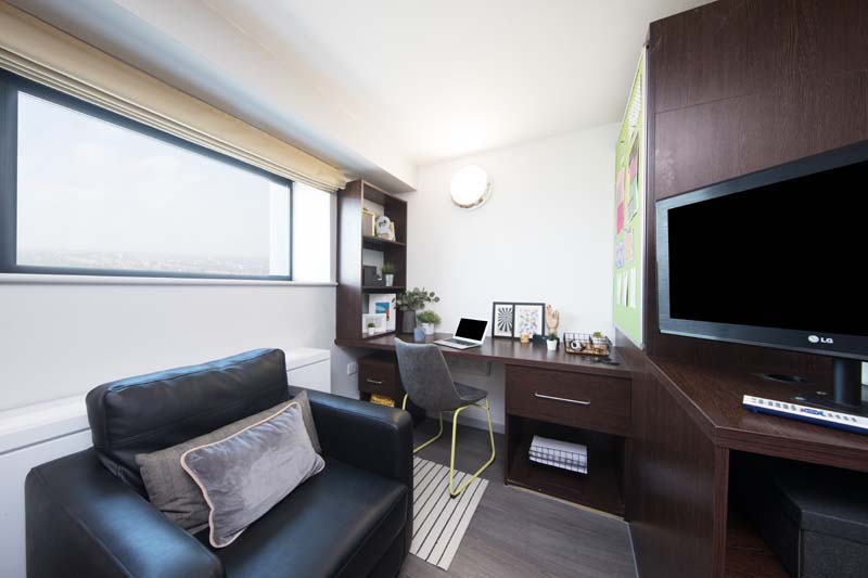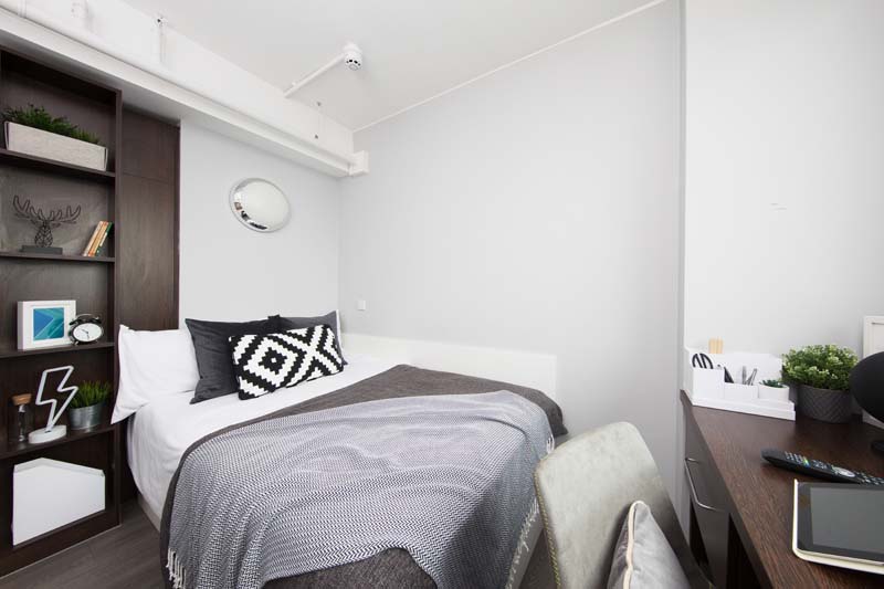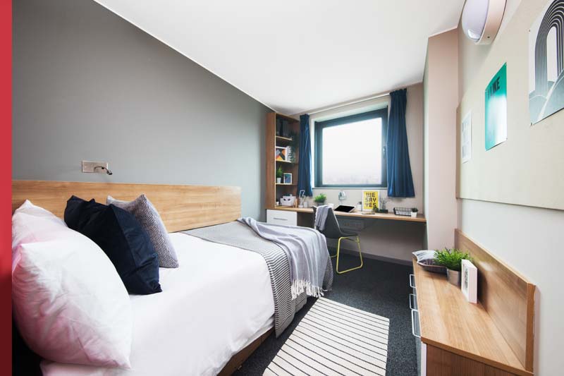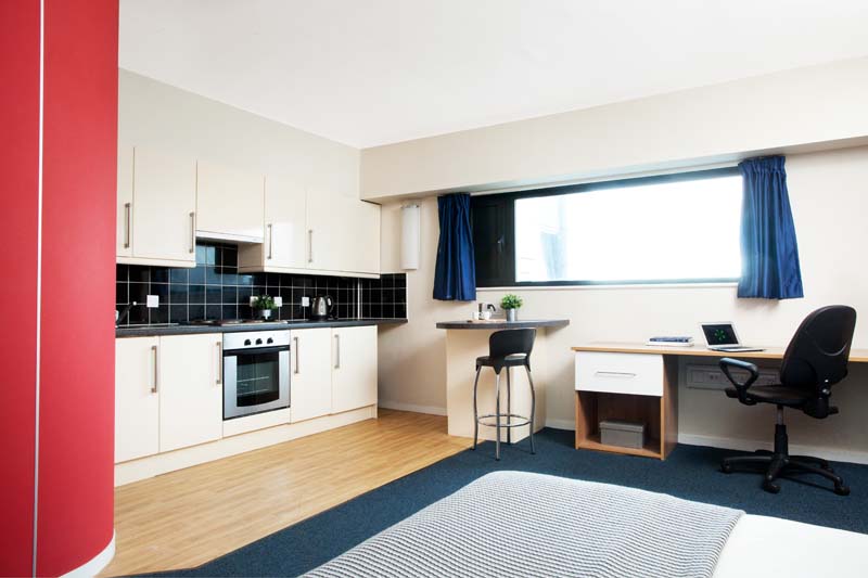 Our studio rooms are perfect for students looking for more privacy. You will have your own en-suite bathroom and fully fitted kitchen, as well as a comfortable bed, a wardrobe, plenty of additional storage for your belongings, and a Wi-Fi connected study space.