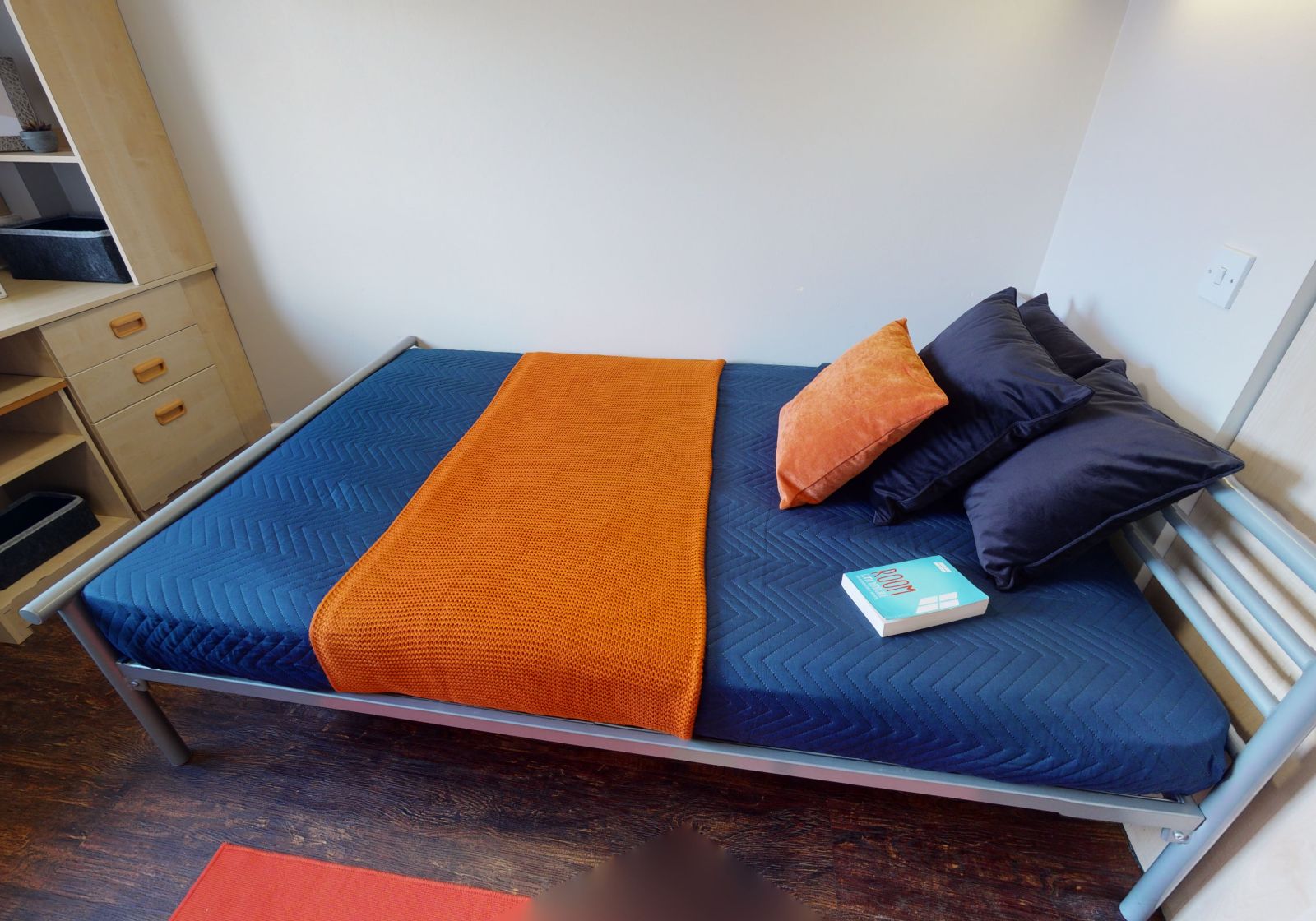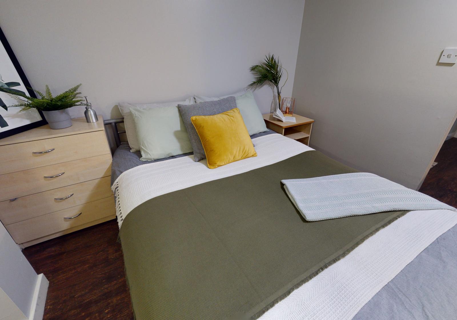 Our excellent value for money Bronze en suite rooms come equipped with a small double bed, private bathroom, study desk and chair and storage in shelves, drawers and a wardrobe, classic and modern to suit any style. Sharing a spacious kitchen and living area with up to five others, the building also provides you with a pool table, onsite laundry and courtyard in the building.