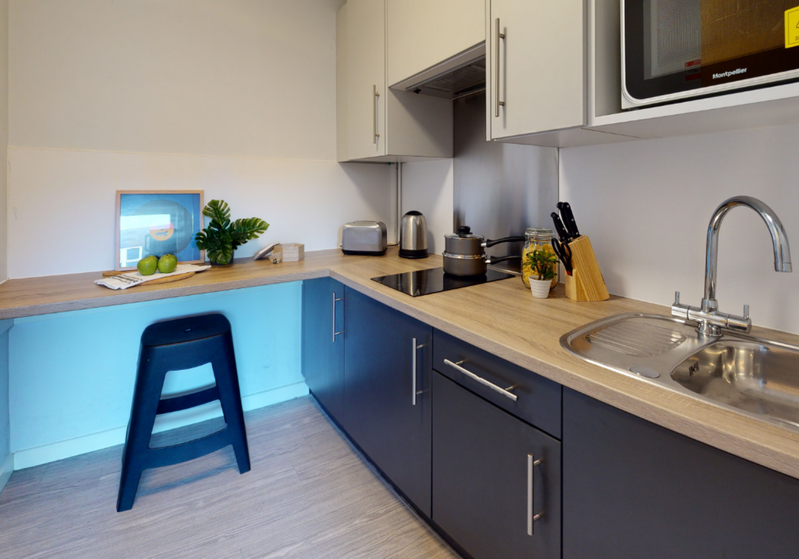 You’ll have your own private bathroom, seperate fully fitted kitchen with hob and combi oven, double bed, large study desk and chair, and armchairs. Offering privacy with lots of storage, you’ll also benefit from building features like an outdoor courtyard with decking and seating plus onsite laundry facilities. Please note that not all our Silver Studio room types have been refurbished.