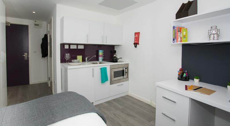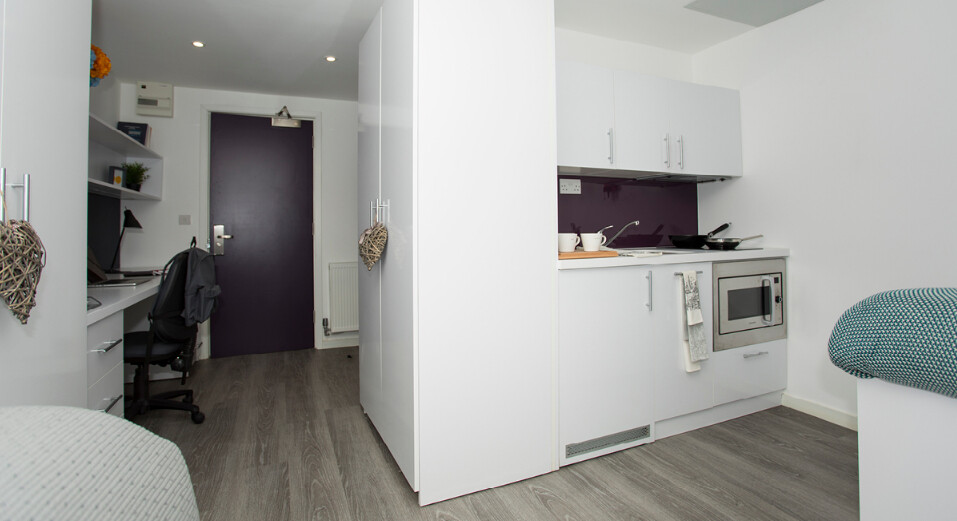 Every aspect of the stylish development is designed to be affordably luxurious. The student studios are high specification, compact, and functional. The kitchen features lacquered cabinetry, solid surface worktop with sink and fully integrated appliances including fridge, combination microwave oven, electric hob and extractor hood.