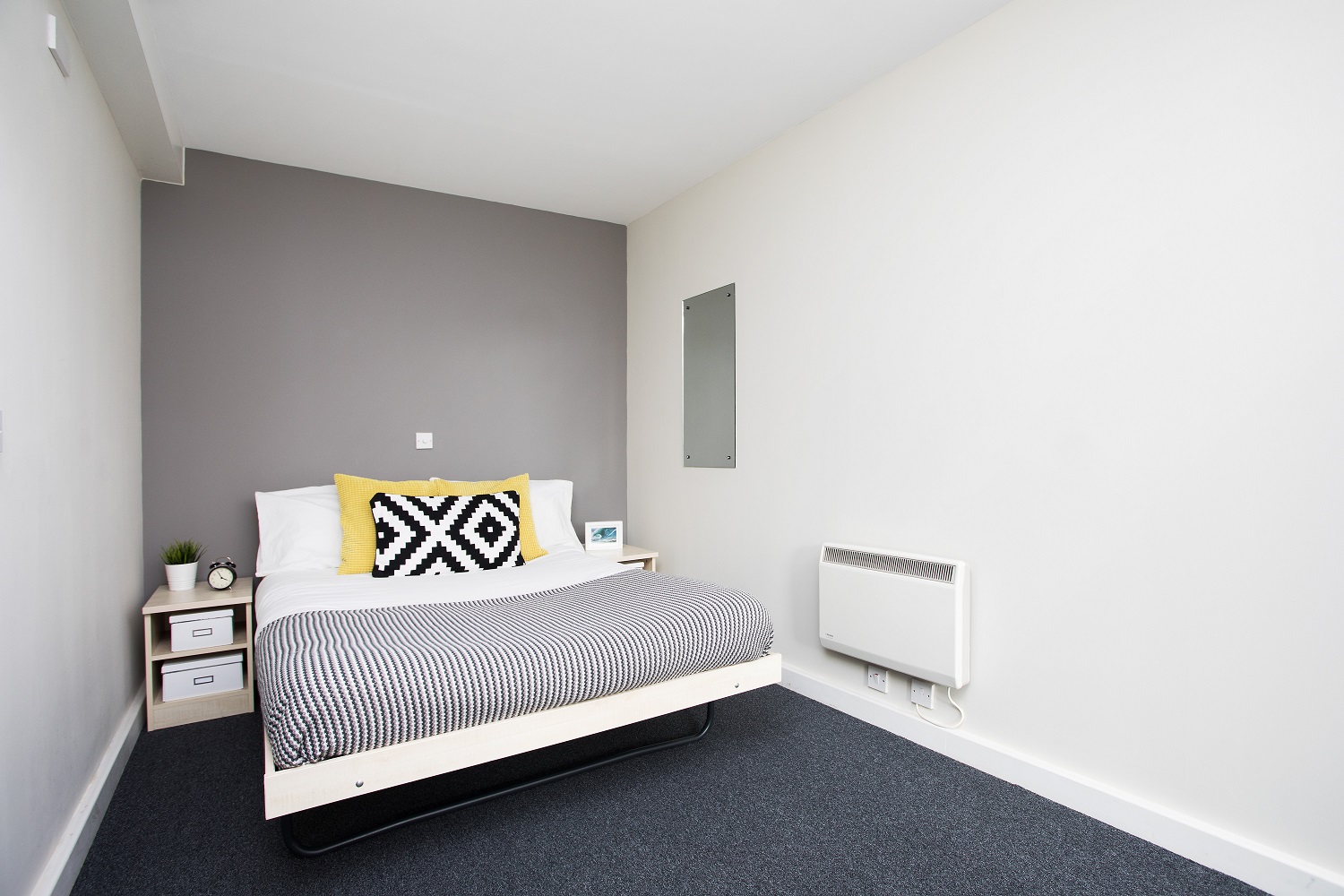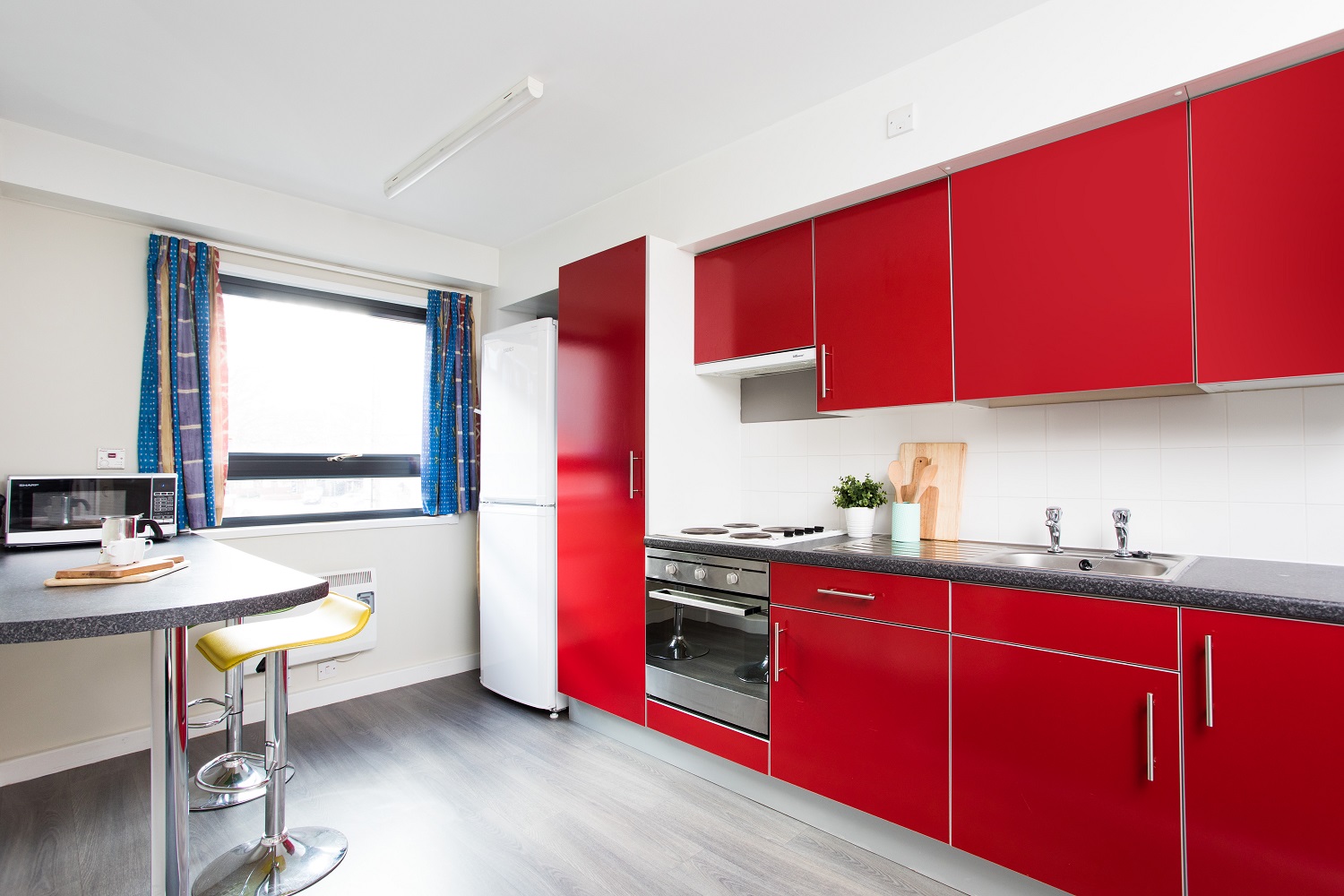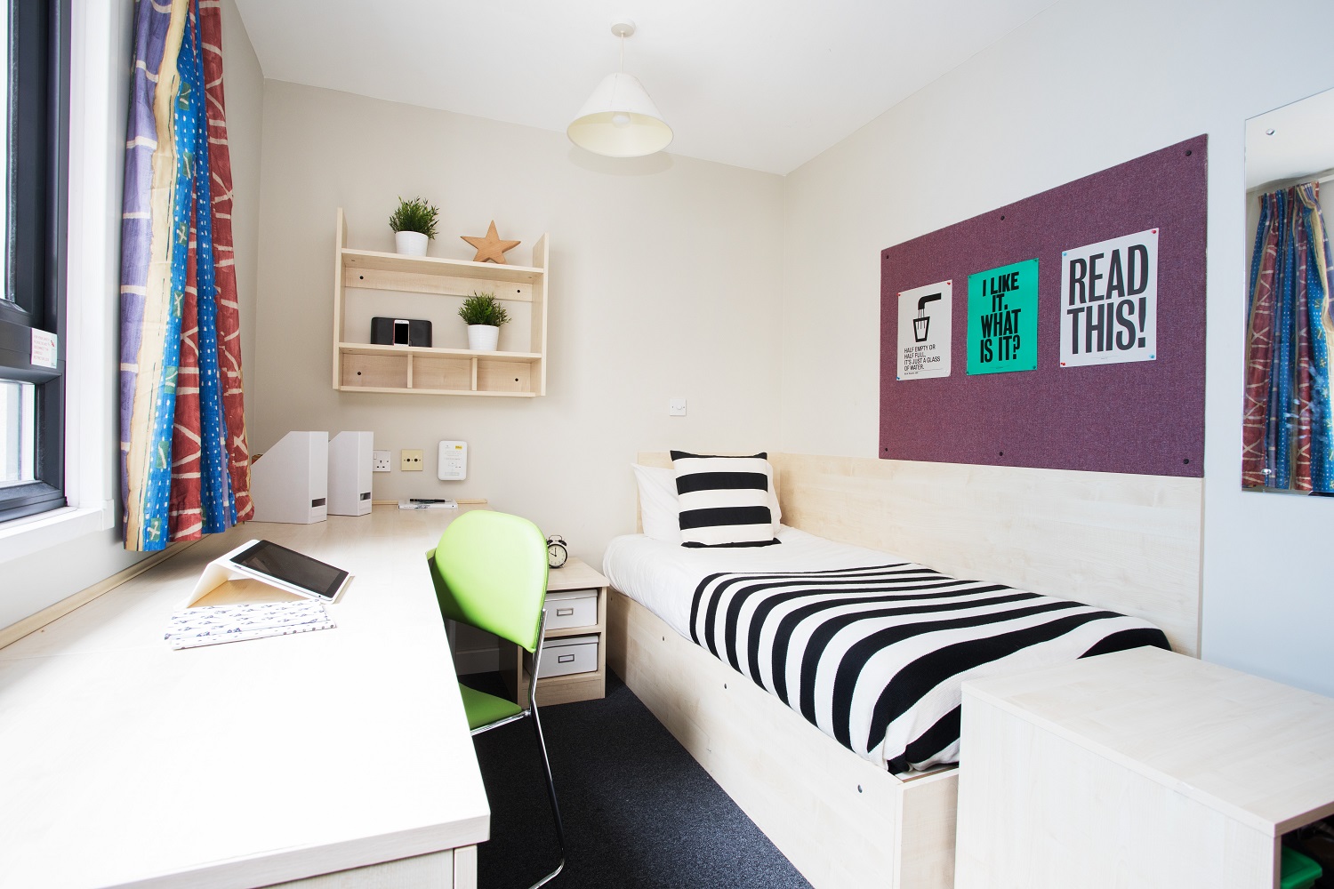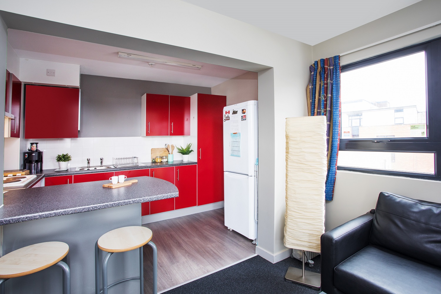 Feel at home in your en-suite room, which has a private shower room with sink and toilet, a comfortable bed and a large Wi-Fi connected study area. As well as a wardrobe, you'll find storage space under your bed and shelves and drawers to store your belongings. Your shared fitted kitchen and living area is an ideal space to relax with your flatmates.