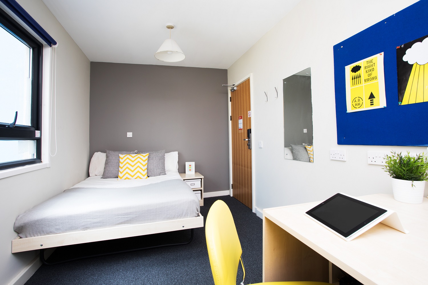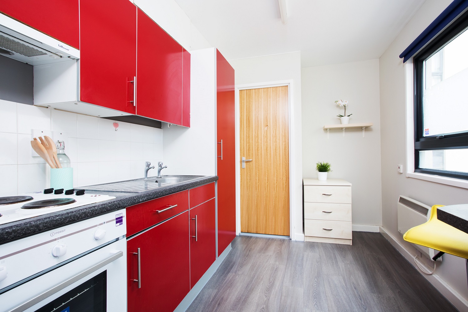 Our studio rooms are perfect for students looking for more privacy. You will have your own en-suite bathroom and fully fitted kitchen, as well as a comfortable bed, a wardrobe, plenty of additional storage for your belongings, and a Wi-Fi connected study space.
