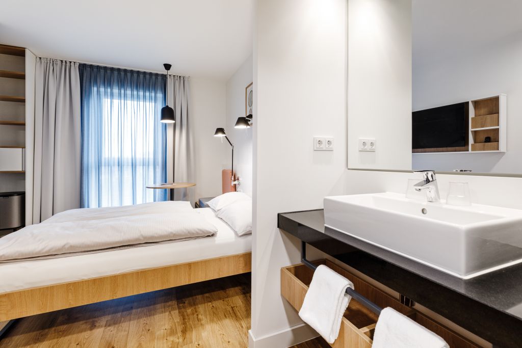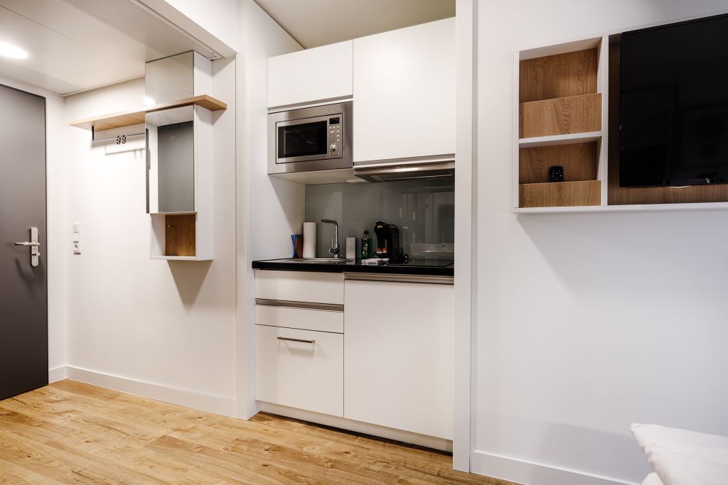 Serviced Apartments – A bit of home for a few weeks or months? The up to 21m² studio is spacious and has a cozy double bed (1.40 m x 2.00 m), a bathroom and a kitchenette included dishes, glasses, bowls, pots. The equipment includes a flat screen TV, dishwasher, hob and microwave.The specified images are sample images.+Uncomplicated check-in on the day of arrival+.1) Use of the free app “Hotelbird” for PreCheckIn and room card.On the day of arrival, you can already check in on the go. Simply enter the booking number and last name of the booking and follow the instructions in the app. Through the app, you use your phone as a key and can no longer lose it.To use the app, you must activate the Bluetooth function!!!2) Use of the checkin-kiosk on site.Our checkin kiosk is available 24/7.Have your booking number and last name of the booking ready and follow the instructions on the screen.Please note that you can only create your room card via app or checkin kiosk after 2pm.1 week before arrival you will receive an email with further information for the arrival day as well as instructions for using the app and the checkin kiosk.We are available for you by phone around the clock. If you would like to speak to a member of staff on site, please refer to the notices at the reception desk in the house.Notice: Displayed prices and data are not final, and should be used for informative purpose only. They are not contractual or binding. Energy pass Certificate type: : Year of construction: 2021 Efficiency class: D Energy consumption: 126kWh / (m²a)