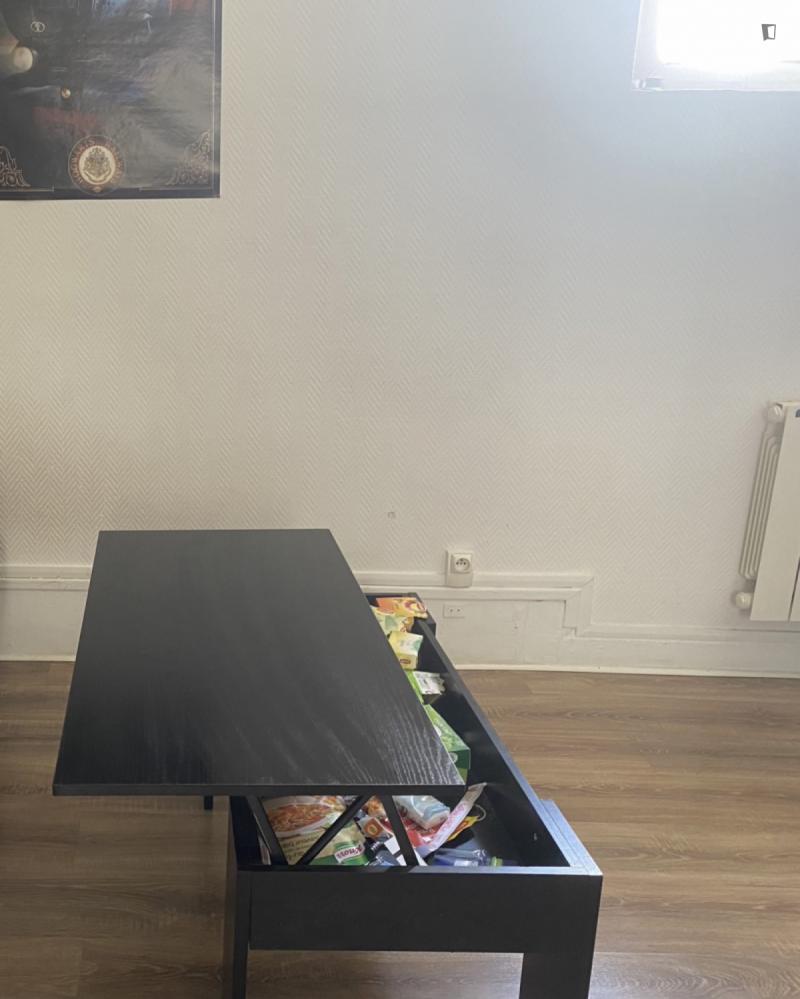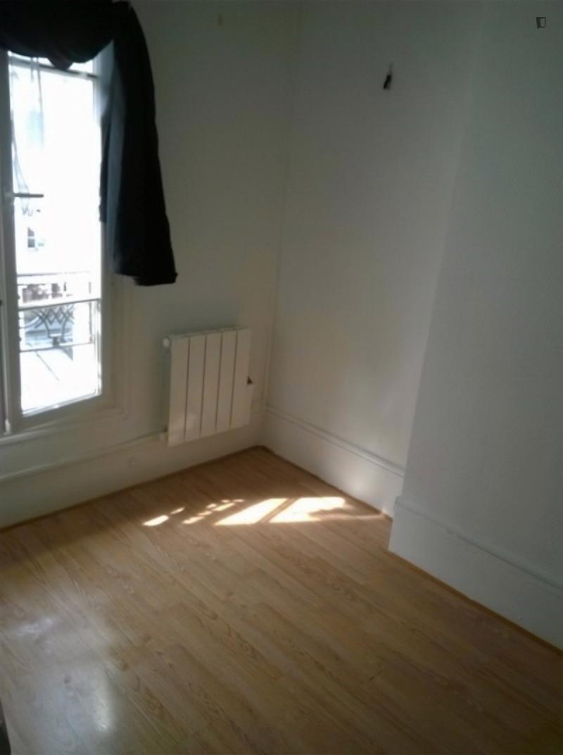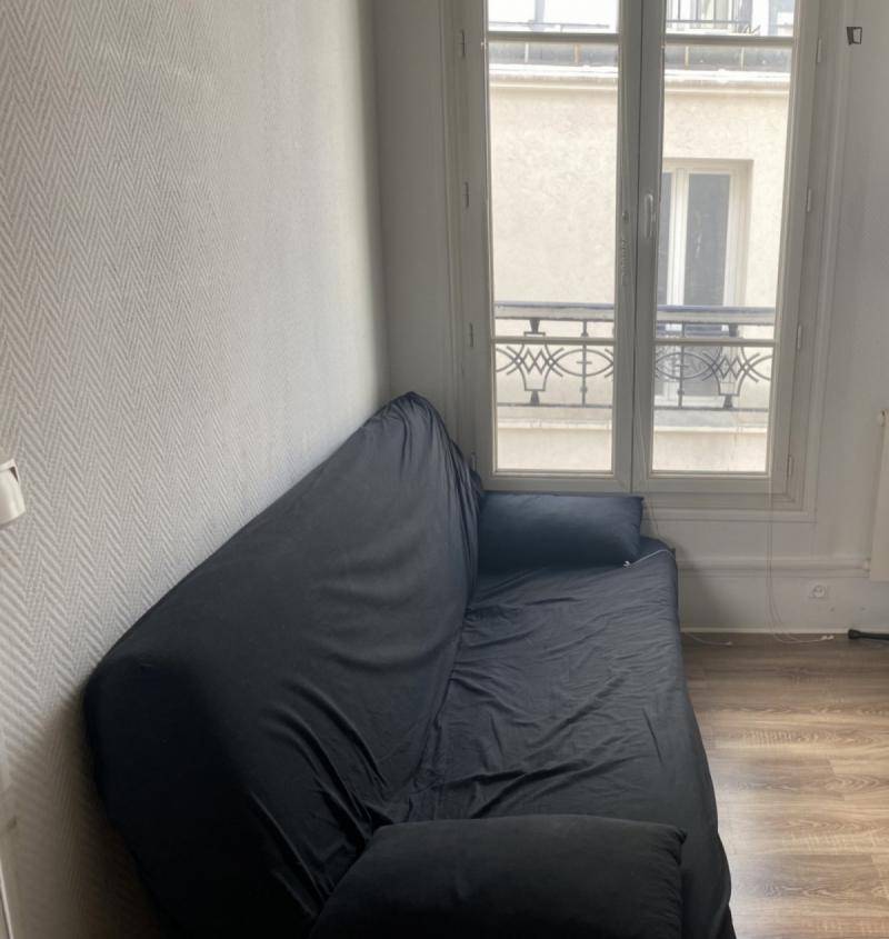 Charming studio located at 3 min walk from Les Halles (rue de l’Olive à Marx Dormoy), 5 min walk from Marx Dormoy metro (line 12), 8 min walk from La Chapelle metro (line 2), 15 min by metro from Gare Saint-Lazare (line 12) All amenities are nearby, lively neighborhood. Entrance, main room, bathroom / WC, small kitchen. The studio is furnished and includes: sofa bed, coffee table with storage, bookcase, TV cabinet, folding wardrobe, shoe chest, kitchen storage, fridge, electric cooking plates. A laundry is located at the foot of the building. The property is very luminous: 3 windows (1 in the kitchen and 2 in the main room) and very calm and quiet: 5th and last floor, courtyard side. Please note that the landlord prefers longer stays, up to 2 years.