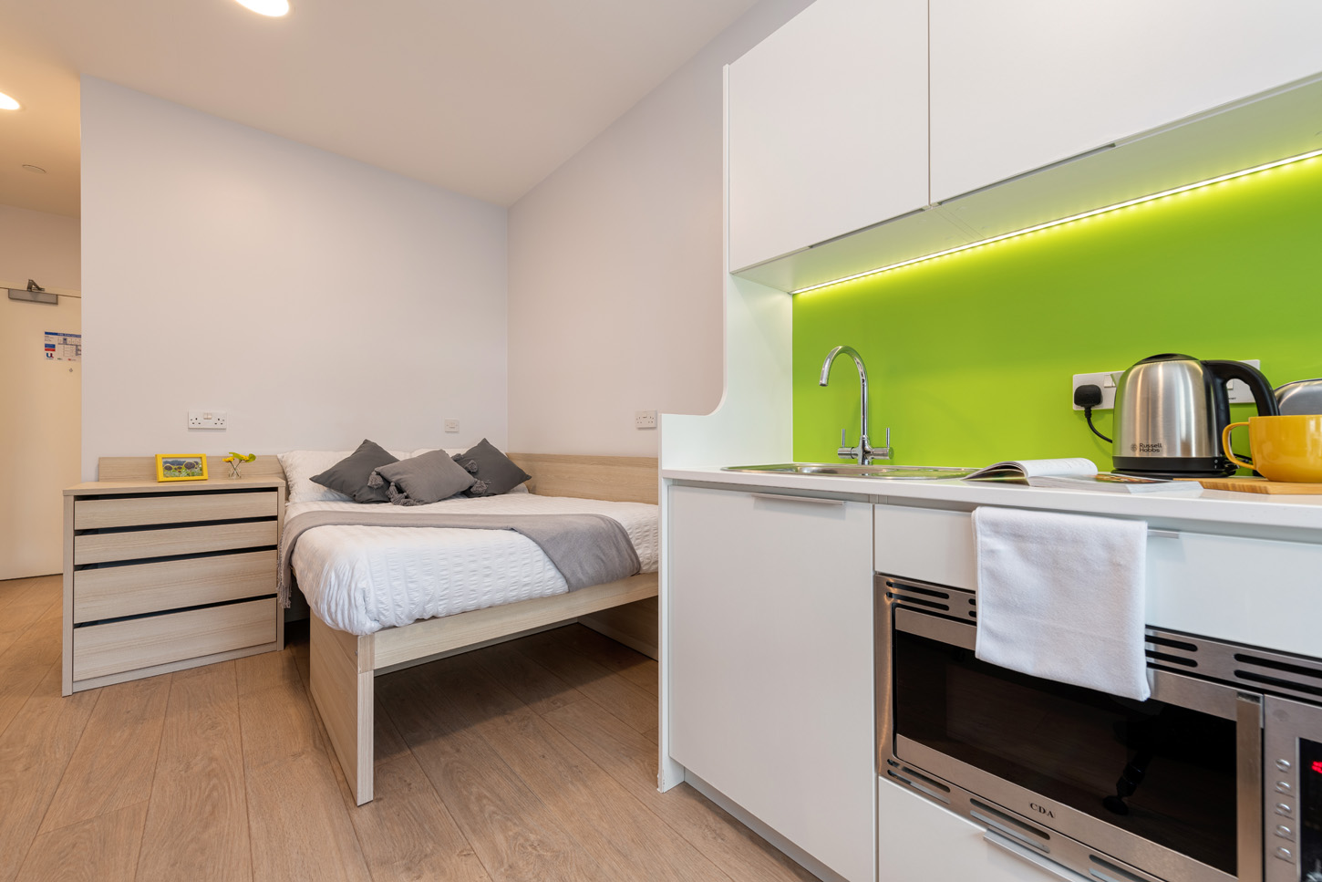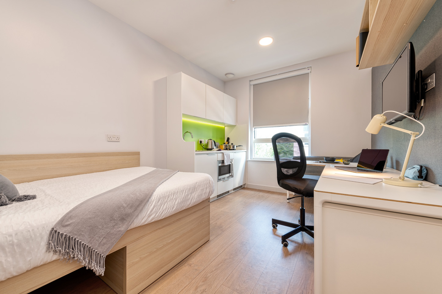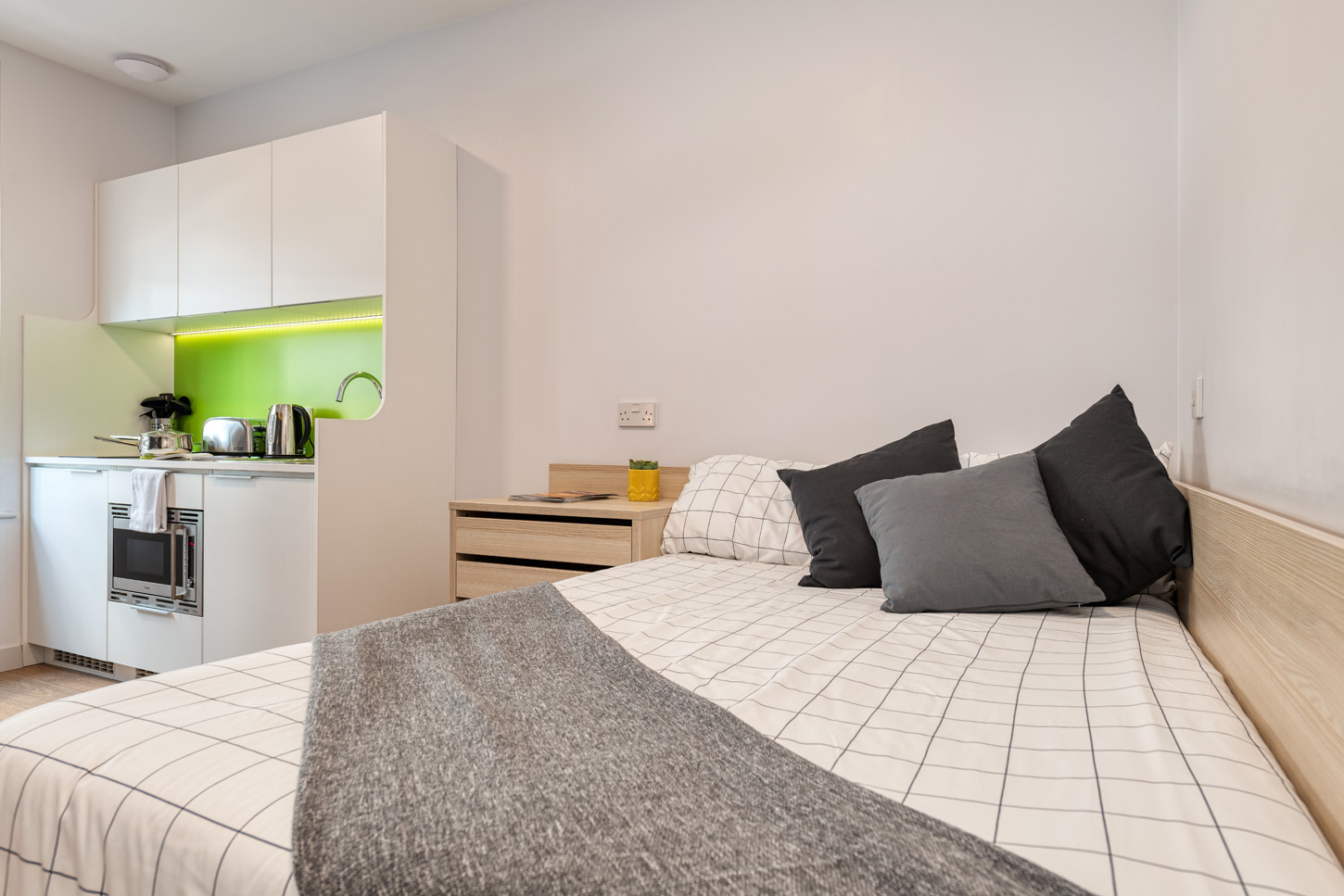 This student accommodation provides studio rooms. Expect a Wi-Fi connection, CCTV camera security and a double bed. There is a 24/7 on-site staff available at the beck and call of students.