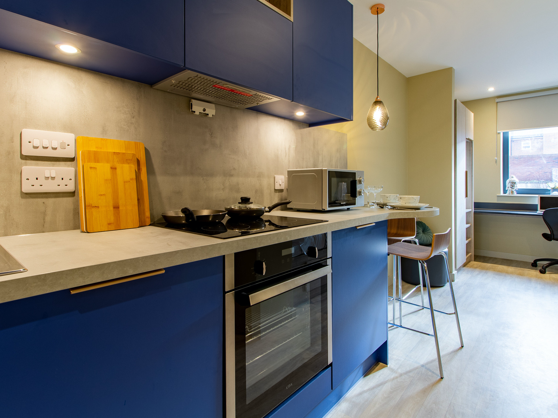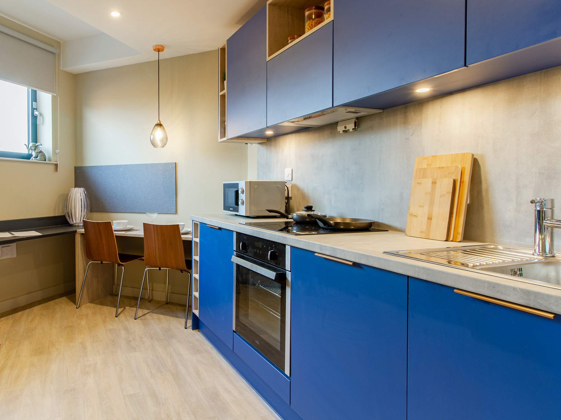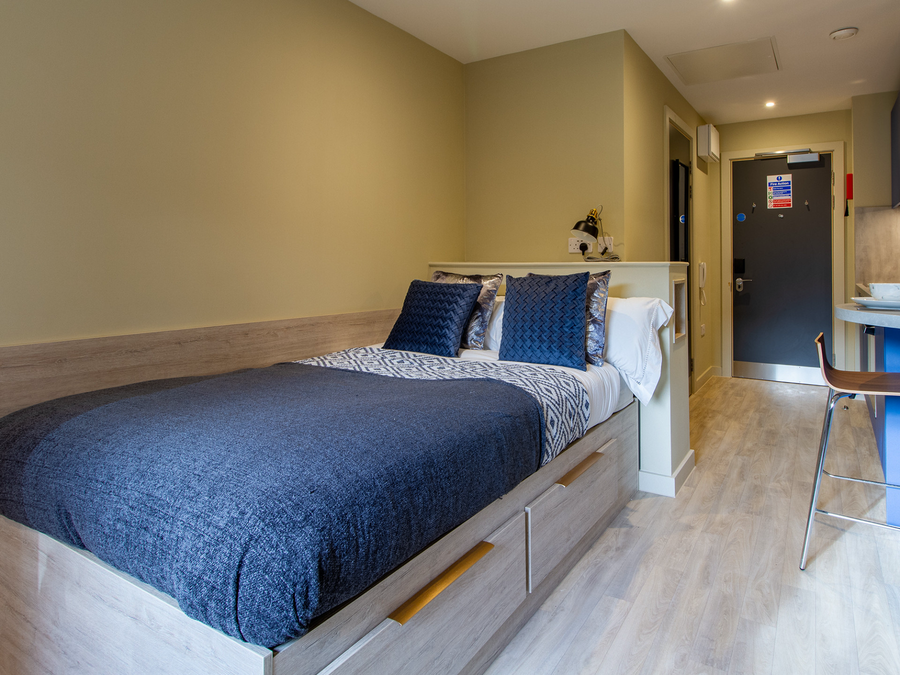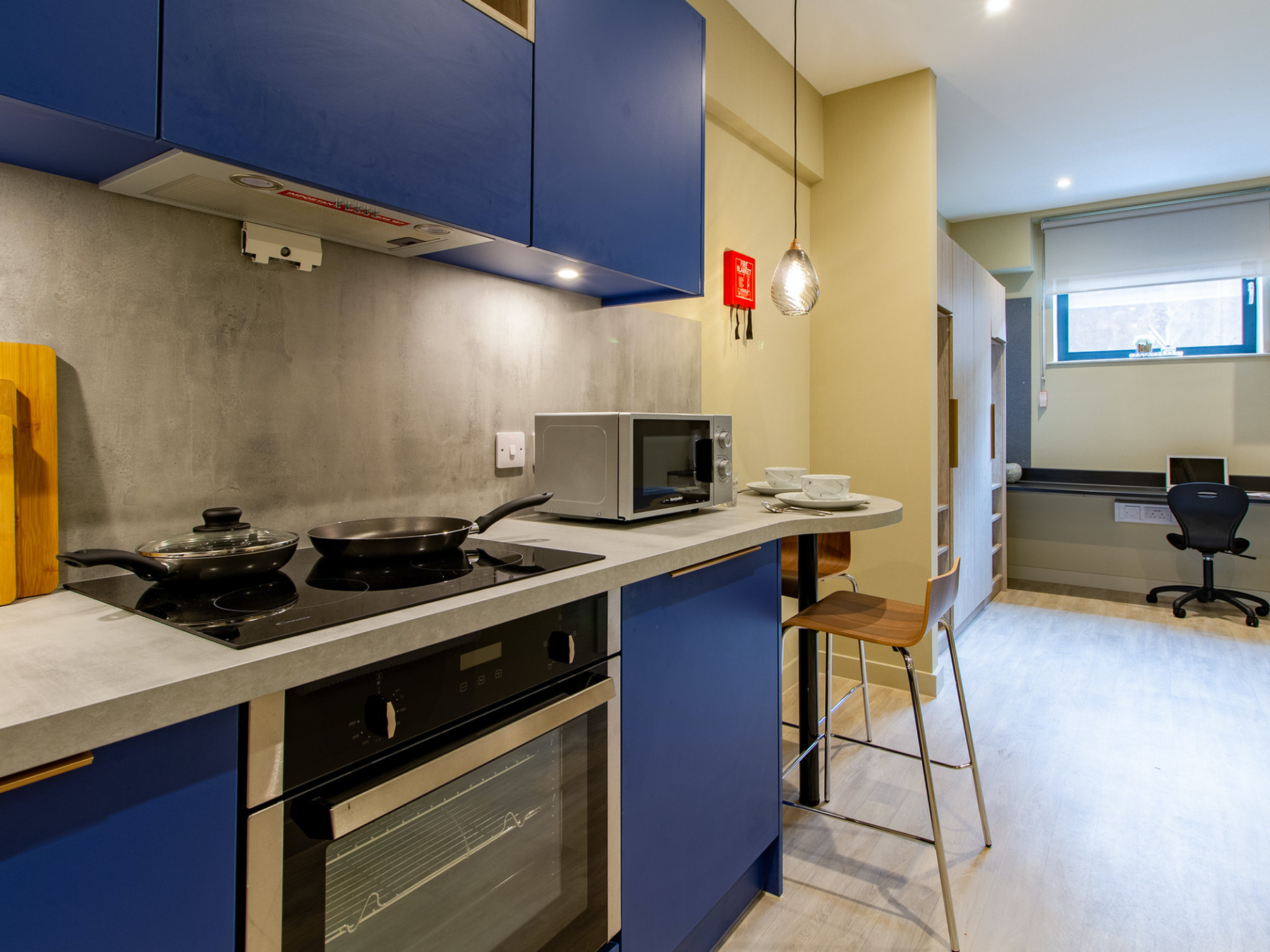 Included in bedroom: 4ft double bed, Bedside table, Desk with three drawers and study chair, Twin/Single seated bean bag chair, 32” Television, TV license not included, Wardrobe, Under bed storage, Low level and high level shelving, Noticeboard, USB ports, Mirror, Corian worktop, Integrated combination oven, Integrated fridge with freezer tray, Four ring induction hob, Built in extraction, Breakfast bar with two stools.