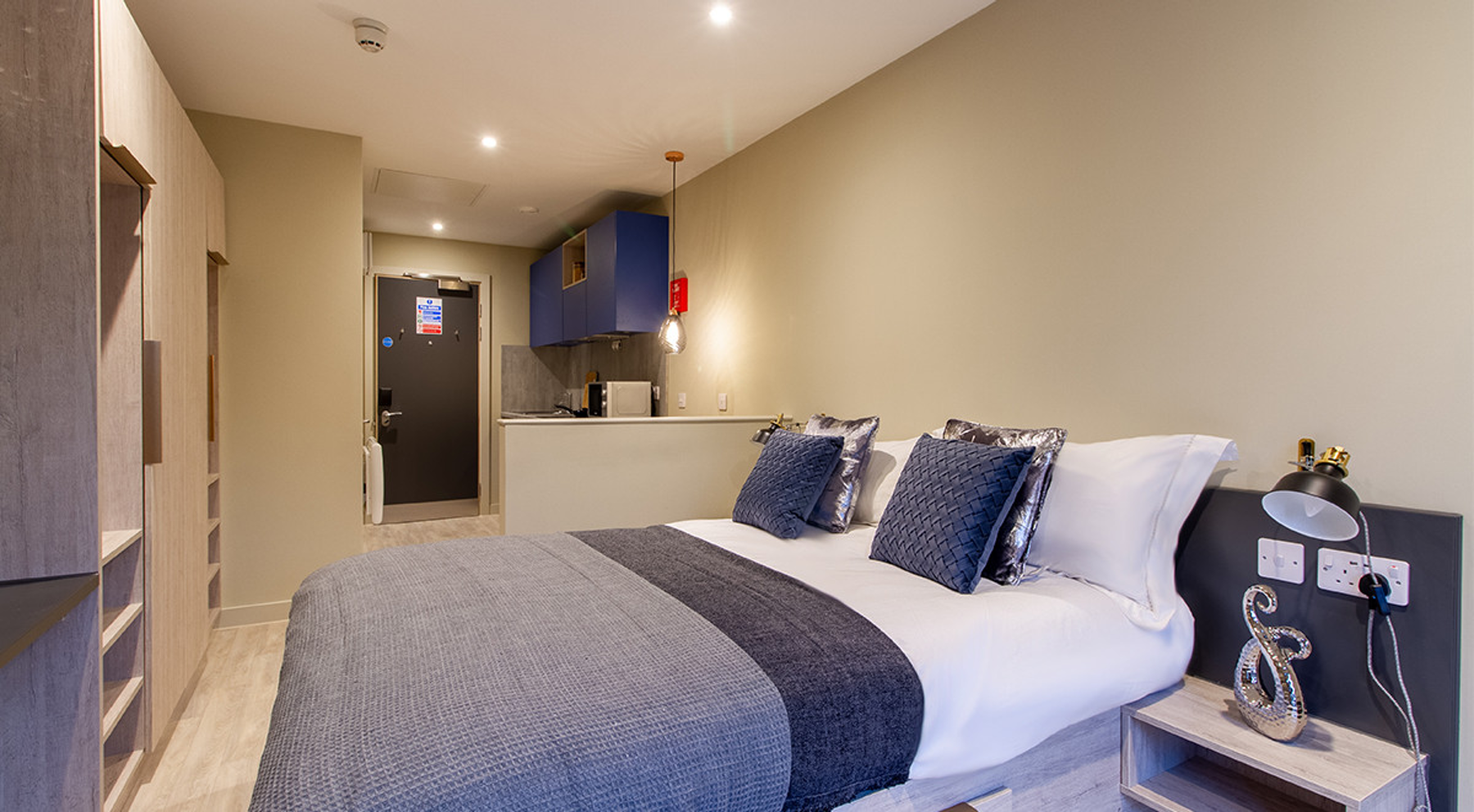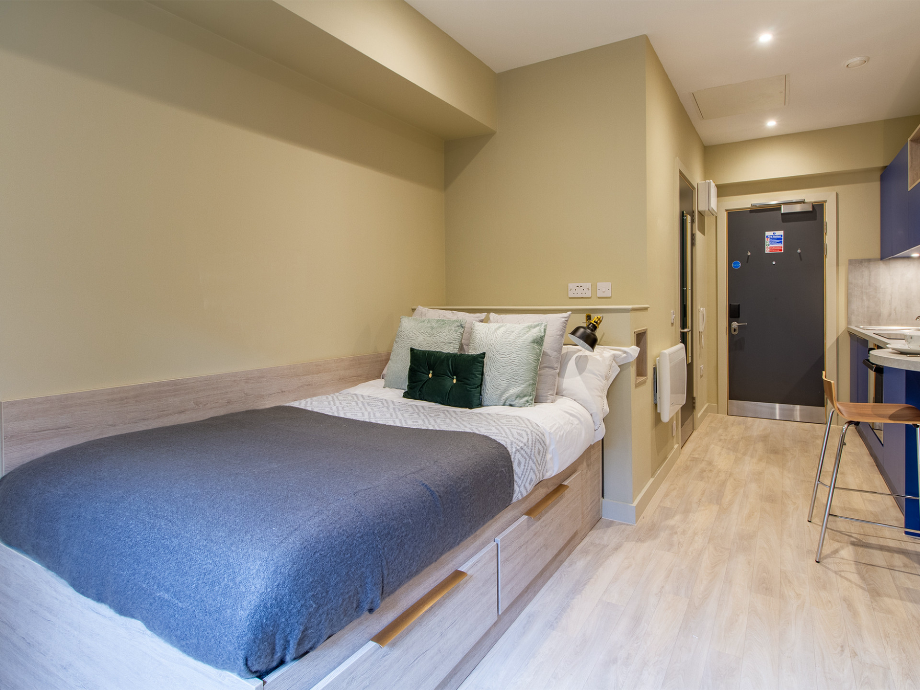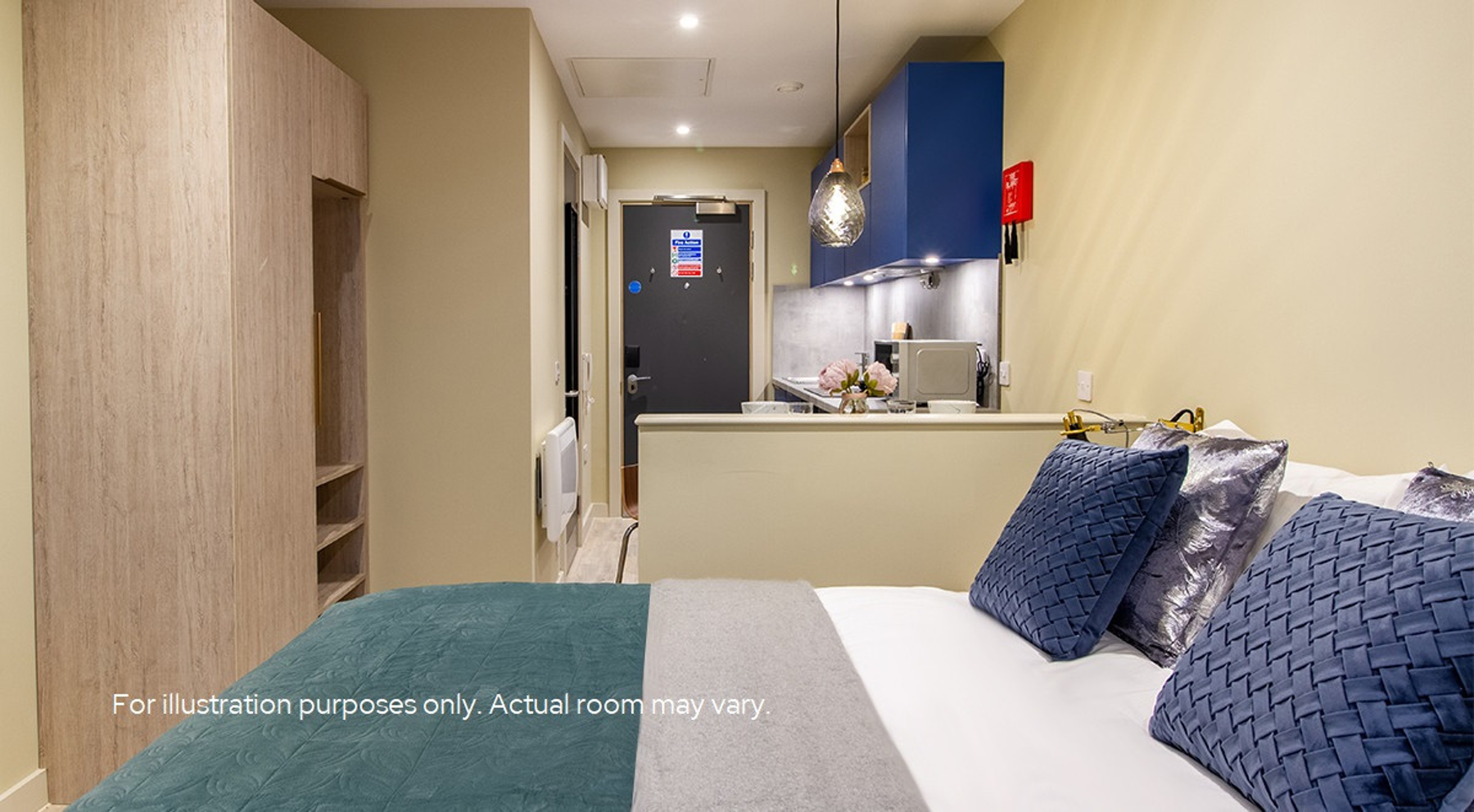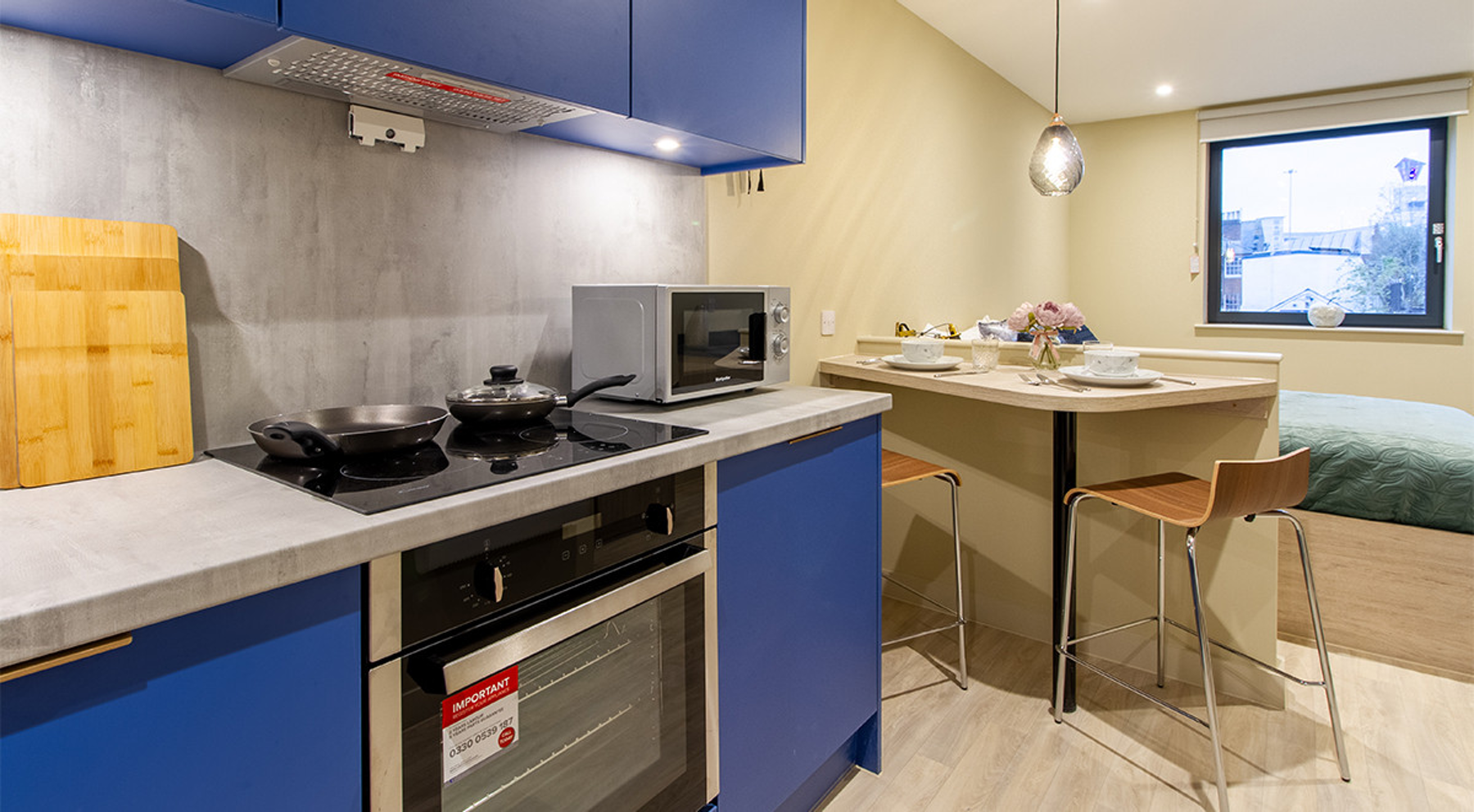 Included in bedroom: 4ft double bed, Bedside table, Desk with three drawers and study chair, Twin/Single seated bean bag chair, 32” Television, TV license not included, Wardrobe, Under bed storage, Low level and high level shelving, Noticeboard, USB ports, Mirror, Corian worktop, Integrated combination oven, Integrated fridge with freezer tray, Four ring induction hob, Built in extraction, Breakfast bar with two stools.