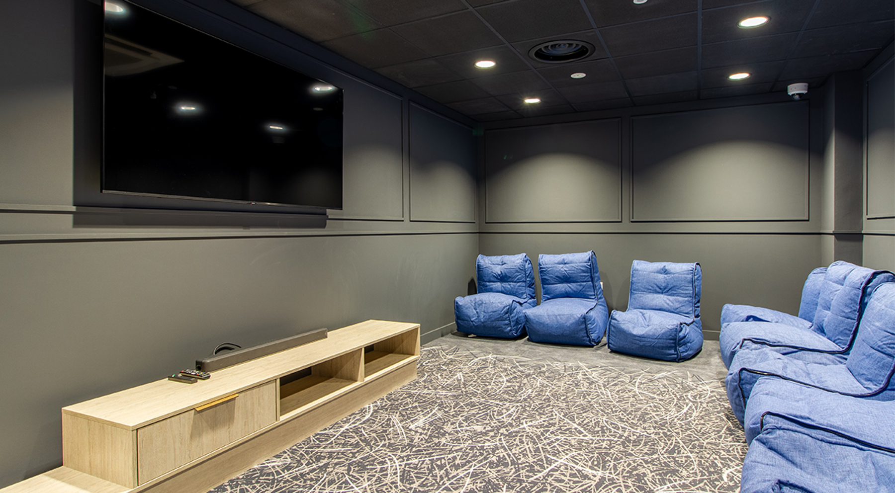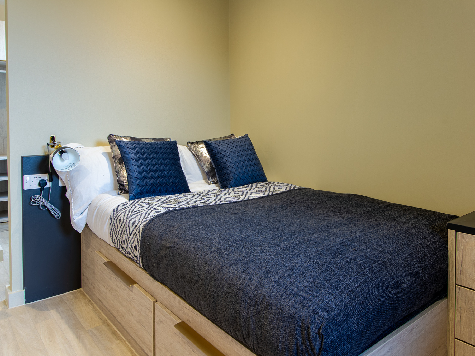 4ft double bed, Bedside table, Desk with three drawers and study chair, Twin/Single seated bean bag chair, 32” Television, TV license not included, Wardrobe, Under bed storage, Low level and high level shelving, Noticeboard, USB ports, Mirror, Corian worktop, Integrated combination oven, Integrated fridge with freezer tray, Four ring induction hob, Built in extraction, Breakfast bar with two stools.