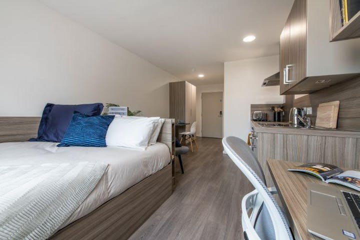 It offers modern en-suite rooms in shared apartment and studio categories. Each accommodation is stacked with a range of amenities, making students feel at home. These amenities include free wifi, kitchenette, study area, wardrobe, lounge area, gaming room, community area, and so much more. The accommodation is curated with expertise for a comfortable and economical stay.