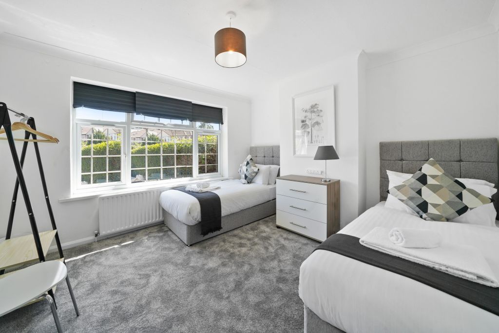 The apartment is located on a quiet area of Langley in Slough. The house has recently undergone a full refurbishment to a high standard and has a light, clean and airy feel. It includes a 5 spacious bedrooms, two full bathrooms and a half bathroom along with a fully fitted kitchen incorporating a dining area. A separate lounge, complete with a large sized, internet connected Smart TV with Virgin Media channels, has easy access to the garden and provides a great area to relax in The house also has off-street and free parking. There are 5 spacious bedrooms on the first and second floors with free standing chest of drawers and an open style clothes rack providing good storage and resting environment. Each bedroom features two single beds which can be put together to create a larger bed if required. . On the first floor, there’s two bathrooms and a half bathroom, these are fully tiled and one with a full bath and the other with a large walk-in shower enclosure. The half bathroom provides an additional W.C and sink basin.The kitchen is equipped to a high standard, so if you are just sorting out breakfast or if you fancy cooking dinner yourself… it includes the basics like electric kettle, toaster, microwave, fridge, plus an electric Hob, fan oven, and it comes fully equipped with kitchenware, utensils, pots and pans, cutlery, crockery and glasses.The whole house is well equipped with just the right mix of quality, meeting high standards and functionality. Age restrictions apply – will not accept requests from anyone under 21 years of age.Notice: Displayed prices and data are not final, and should be used for informative purpose only. They are not contractual or binding. Energy pass This building is not subject to EnEV.