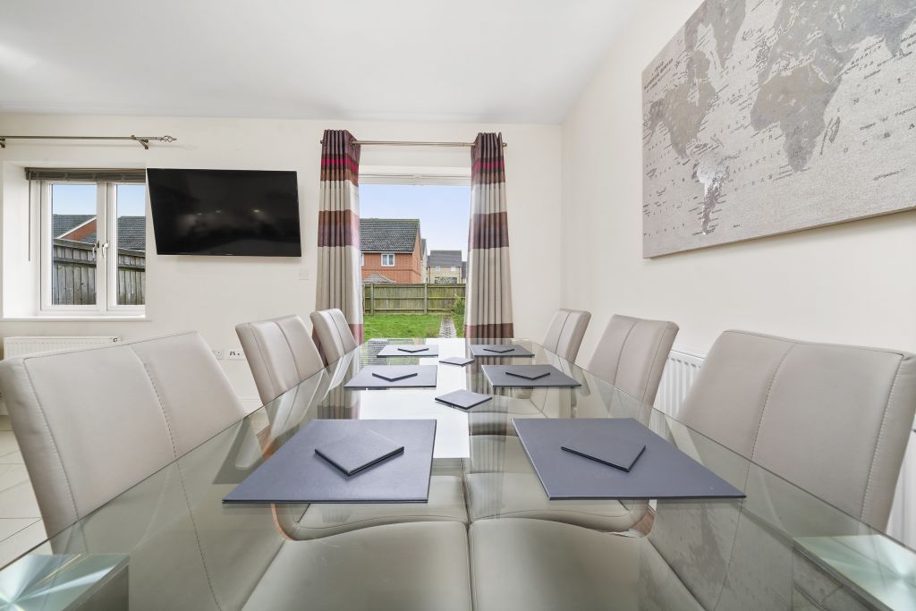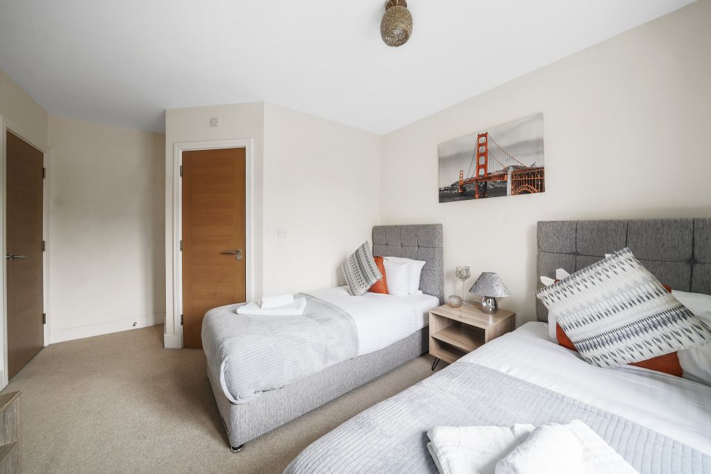 London Heathrow Living Serviced House 4 bedrooms 2.5 bathrooms, sleeps 11 is very near to Heathrow T4 yet in a quiet residential street in Stanwell. Newly built, it has a light and spacious feel to it. With four bedrooms and two bathrooms plus an additional, separate toilet, it comfortable sleeps up to 11. Beds are singles throughout so good for groups as well as families travelling together. The fully equipped kitchen/dining room even has a sofa, guaranteeing a pleasant and sociable ‘heart of the house’ feel to it. The living room has Smart TV, Amazon Alexa, colour Wi-Fi printer, DVD player and fast and free WiFi, which is of course available throughout the house. The kitchen is equipped to a high standard, so if you are just sorting out breakfast or if you fancy cooking dinner yourself… it includes the basics like electric kettle, toaster, microwave, fridge, plus large five burner Gas Hob, electric fan oven, and it comes fully equipped with kitchenware, utensils, pots and pans, cutlery, crockery and glasses as you would expect and always get with Ferndale Apartments. Overseas guests will be particularly pleased to see a rice cooker.This two-storey house has allocated off-street parking for two vehicles with no height restriction. The living arrangements include the master bedroom having a well aportioned en-suite bathroom attached as well as fitted wardrobe and chest drawers. Sleeping arrangements are two single beds with Bedroom 2 & 3. One single for Bedroom 4.